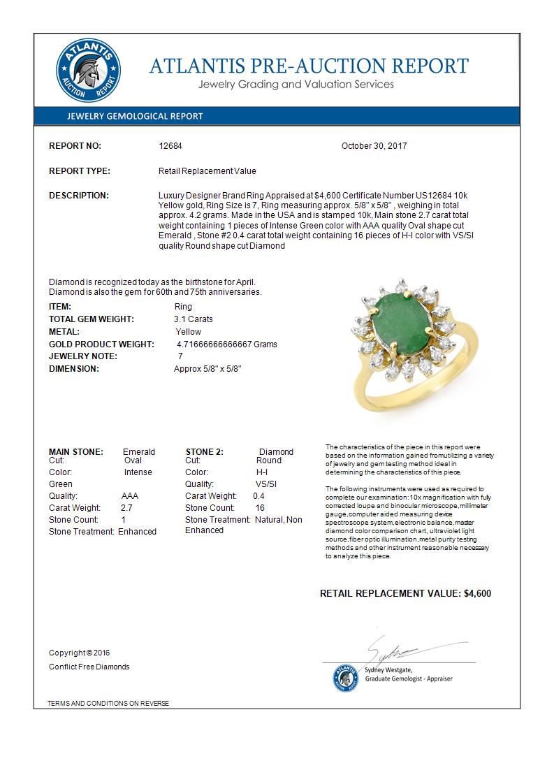 12684 - REF-70Y2X ---- 3.10 CTW Emerald & Diamond Ring 10K Yellow Gold ---- Luxury Designer Brand Ring Appraised at $4,600 Certificate Number US12684 10k Yellow gold, Ring Size is 7, Ring measuring approx. 5/8" x 5/8" , weighing in total approx. 4.2 grams. Made in the USA and is stamped 10k, Main stone 2.7 carat total weight containing 1 pieces of Intense Green color with AAA quality Oval shape cut Emerald , Stone #2 0.4 carat total weight containing 16 pieces of H-I color with VS/SI quality Round shape cut Diamond