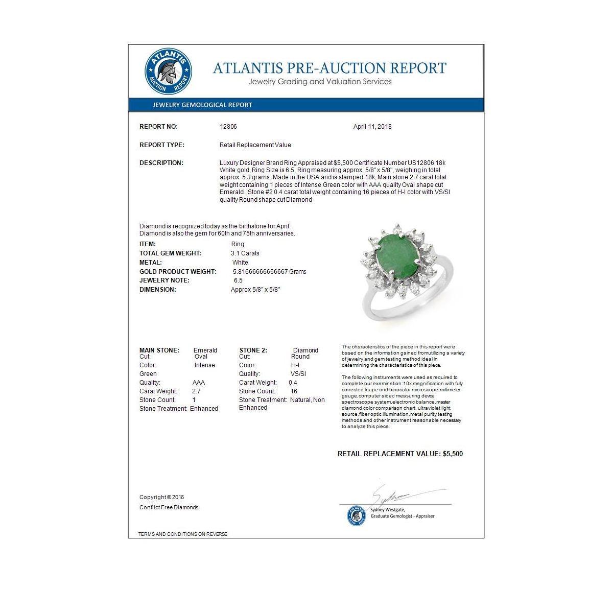 REF-83A6X -12806 ---- 3.10 CTW Emerald & Diamond Ring 18K White Gold ---- Luxury Designer Brand Ring Appraised at $5,500 Certificate Number US12806 18k White gold, Ring Size is 6.5, Ring measuring approx. 5/8" x 5/8", weighing in total approx. 5.3 grams. Made in the USA and is stamped 18k, Main stone 2.7 carat total weight containing 1 pieces of Intense Green color with AAA quality Oval shape cut Emerald , Stone #2 0.4 carat total weight containing 16 pieces of H-I color with VS/SI quality Round shape cut Diamond