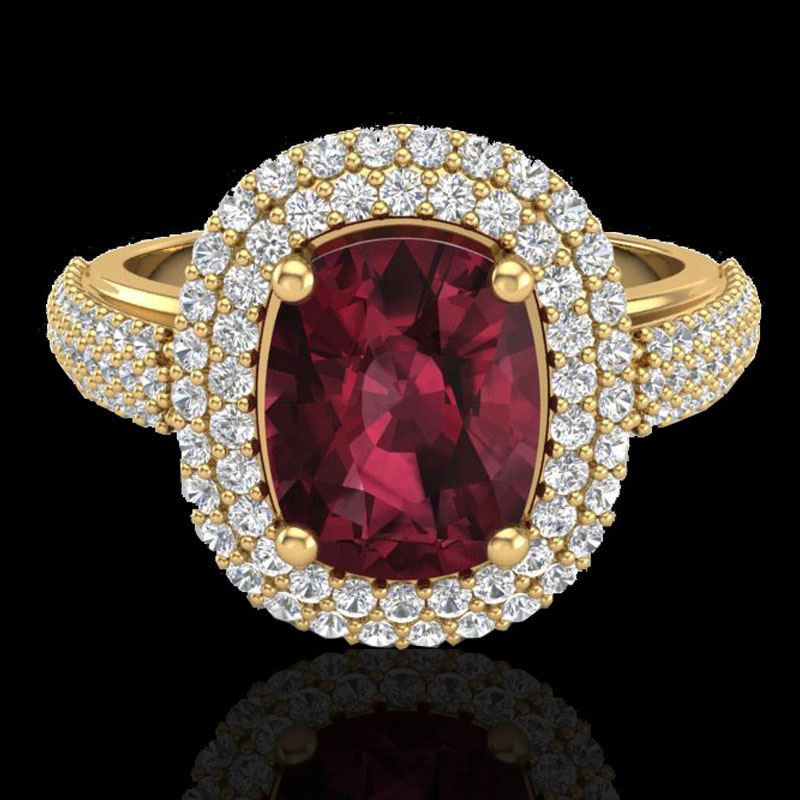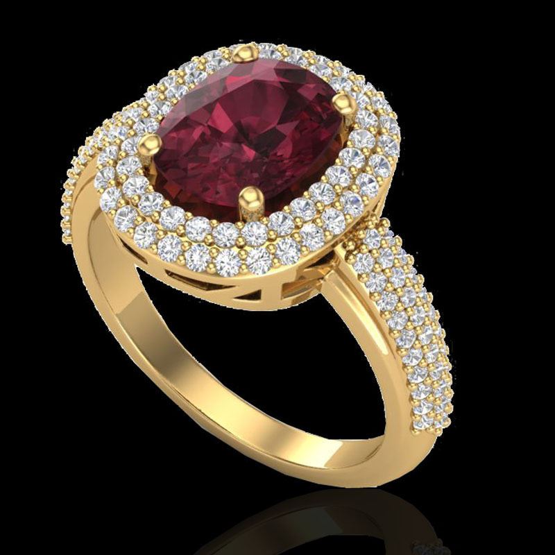REF-81T8M -20713 ---- 3.10 CTW Garnet & Micro Pave VS/SI Diamond Halo Ring 10K Yellow Gold ---- Luxury Designer Brand Ring Appraised at $5,400 Certificate Number US20713 10k Yellow gold, Ring Size is 7, Ring measuring approx. 1/2" X 9/16" , weighing in total approx. 6 grams. Made in the USA and is stamped 10k, Main stone 2.1 carat total weight containing 1 pieces of Saturated purplish Red color with AAA quality Cushion shape cut Garnet , Stone #2 1 carat total weight containing 122 pieces of H-I color with VS/SI quality Round shape cut Diamond