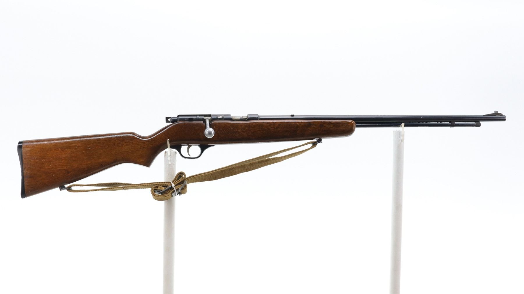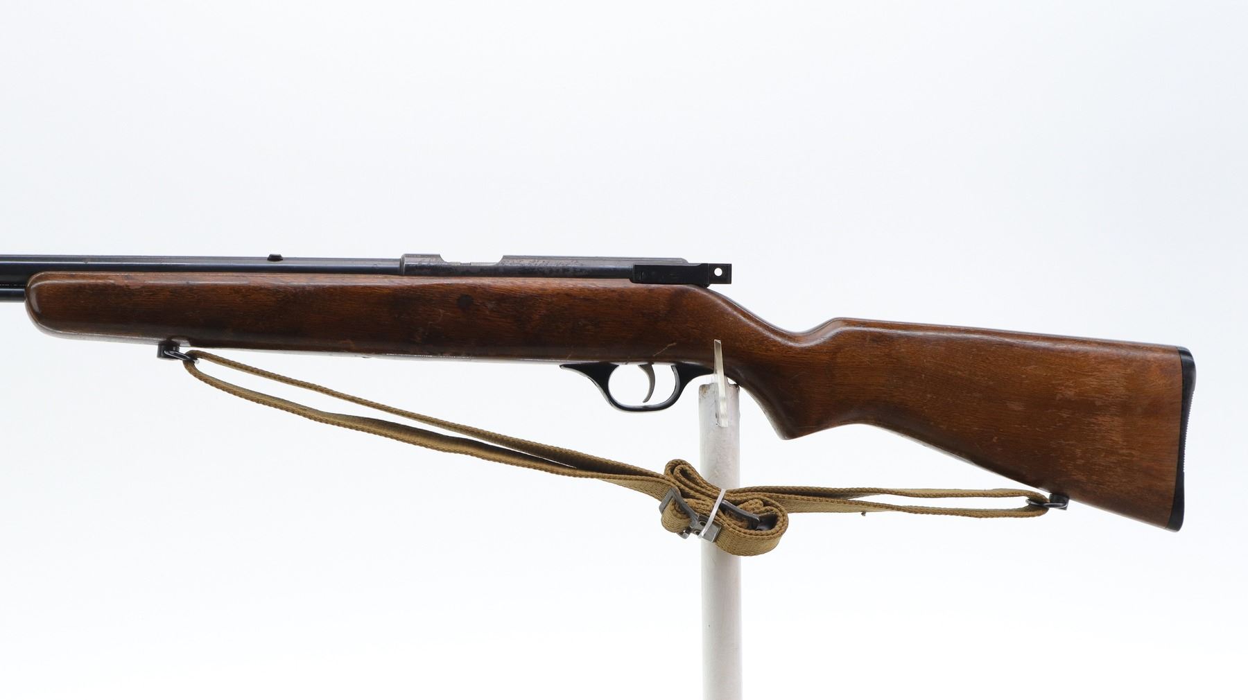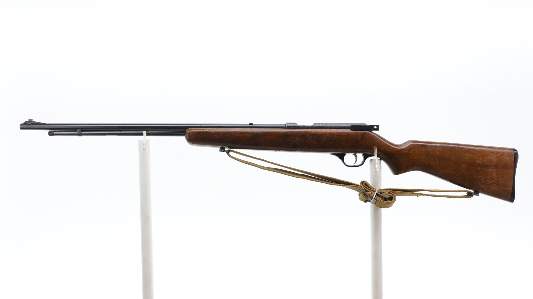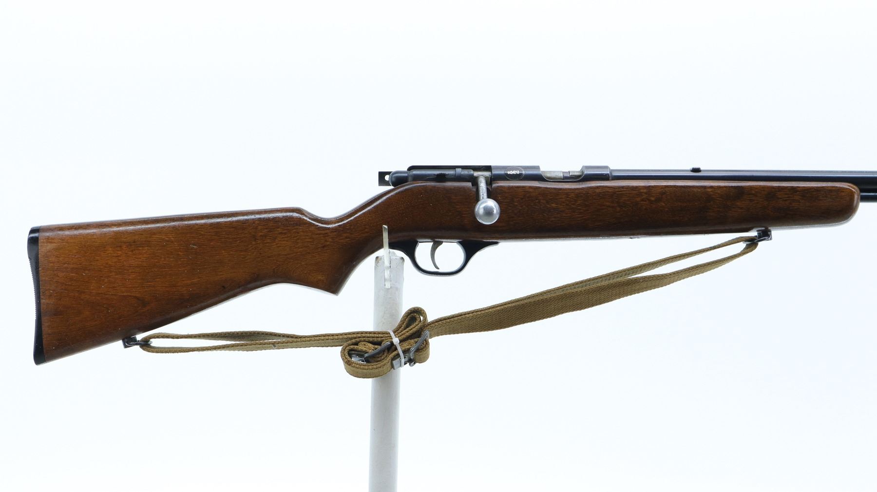 3/10. MARLIN. MODEL: 81DL. CALIBER: .22 LR. BORE IS GOOD AND SHINY. BLADE FRONT SIGHT WITH RAMP, MISSING REAR SIGHT, BASE PRESENT, BLUED FINISH, RECEIVER HAS PEEP SIGHT BASE INSTALLED, NO TOP PORTION INCLUDED. ONE PIECE SMOOTH WOOD STOCK, PISTOL GRIP, GROOVED BLACK POLYMER BUTT PLATE, SWIVELS WITH WWII BRITISH CANVAS STRAP INSTALLED. METAL FINISH SHOWS SOME PITTING, RUST, HANDLING MARKS AND WEAR, STOCK SHOWS SOME MARKS, SCRATCHES AND WEAR. ACTION: BOLT ACTION RIFLE . BARREL LENGTH: 24". SERIAL# NA. CONDITION: 3/10. CLASS: CANADIAN NON RESTRICTED