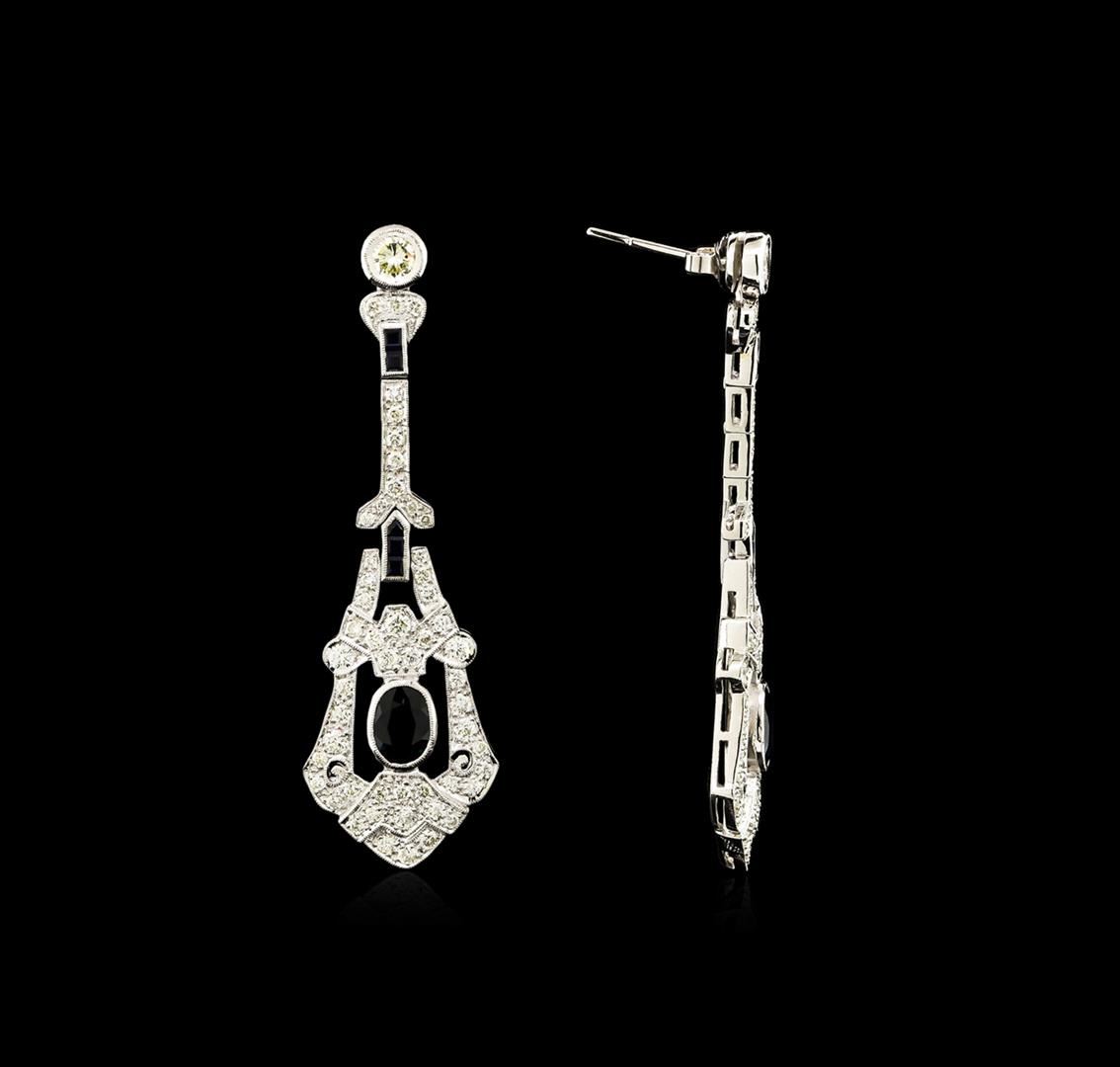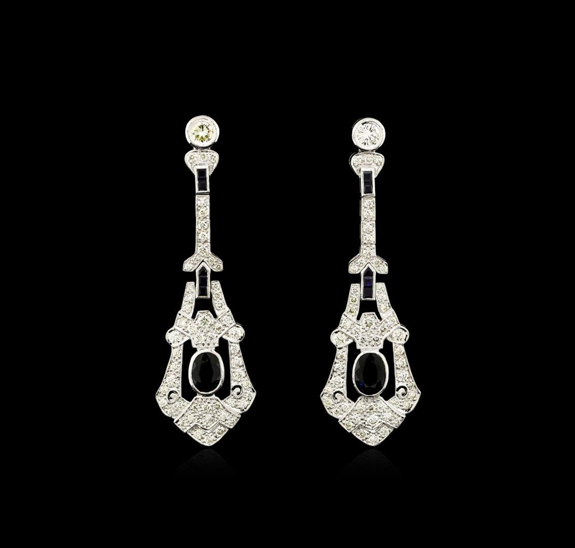 One pair electronically tested 18KT white gold lady's combination cast & assembled dangle earrings with medium friction backs with a bright polish finish. The featured ladies' earrings are 60 millimeters in length. Identified with markings of "18K". Condition is new, good workmanship. Containing: Two bezel set oval modified brilliant cut natural blue sapphires, measuring 7.95 x 5.95 x 3.43mm, approximate total weight of 2.80ct., clarity is moderately included, type II, medium dark, moderately strong, blue color, (GIA B 6/4), cut is good. Colored gemstones are presumed to have been subjected to commonly used enhancement processes. Graded in the setting. Ten channel set square step cut natural blue sapphires, measuring 1.80 x 1.70 x 1.14mm, approximate total weight of 0.30ct., clarity is eye clean, type II, medium dark, moderately strong, blue color, (GIA B 6/4), cut is good. Colored gemstones are presumed to have been subjected to commonly used enhancement processes. Graded in the setting. Two bezel set round brilliant cut diamonds, measuring 4.15 - 4.10 x 2.48mm (depth est.) approximate total weight of 2 Stones = 0.51ct. Graded in the setting. Clarity: VS-2. Color: H - I. Cut Very Good One Hundred Six bead set round brilliant cut diamonds, measuring 2.20 - 2.00 x 1.30mm (depth est.) approximate total weight of 106 Stones = 3.70ct. Graded in the setting. Clarity: VS-1 to SI-1. Color: H - I. Cut Very Good. Total Weight of Colored Stones 3.10ct. Total Weight of Diamonds 4.21ct. Total Weight of Earrings 13.50gm. GAS Appraised at $15,080.00.