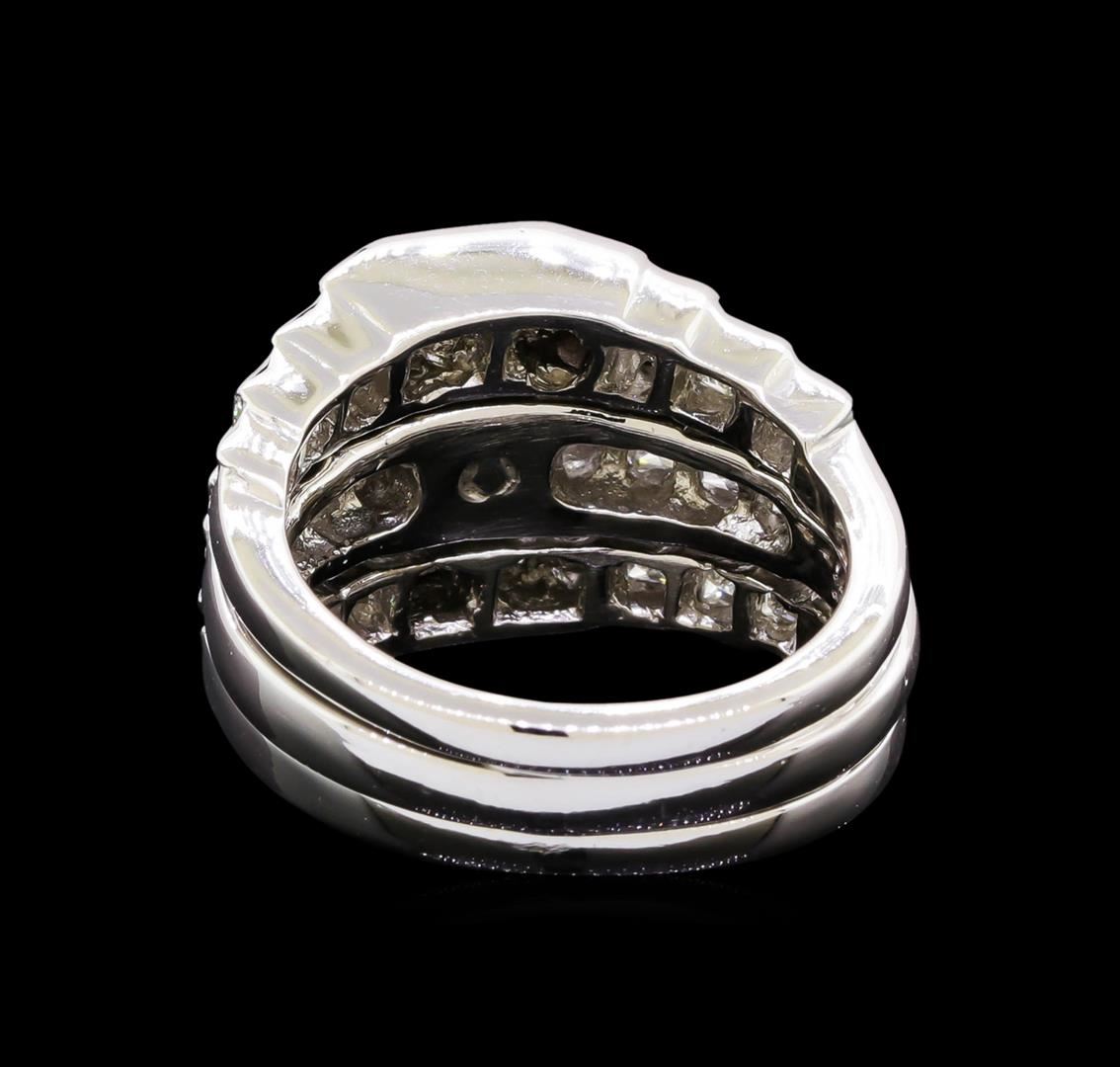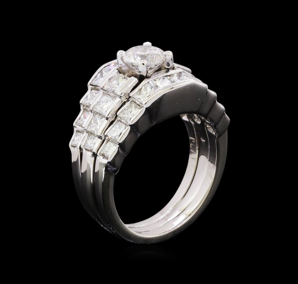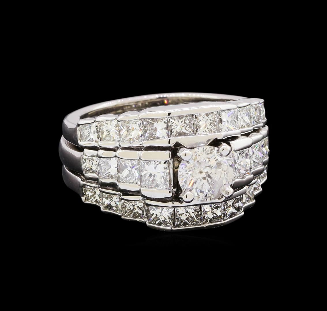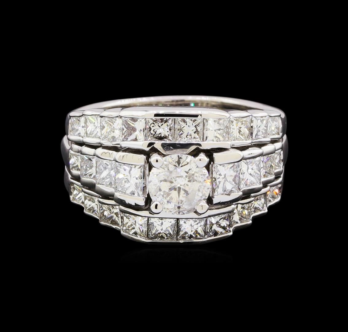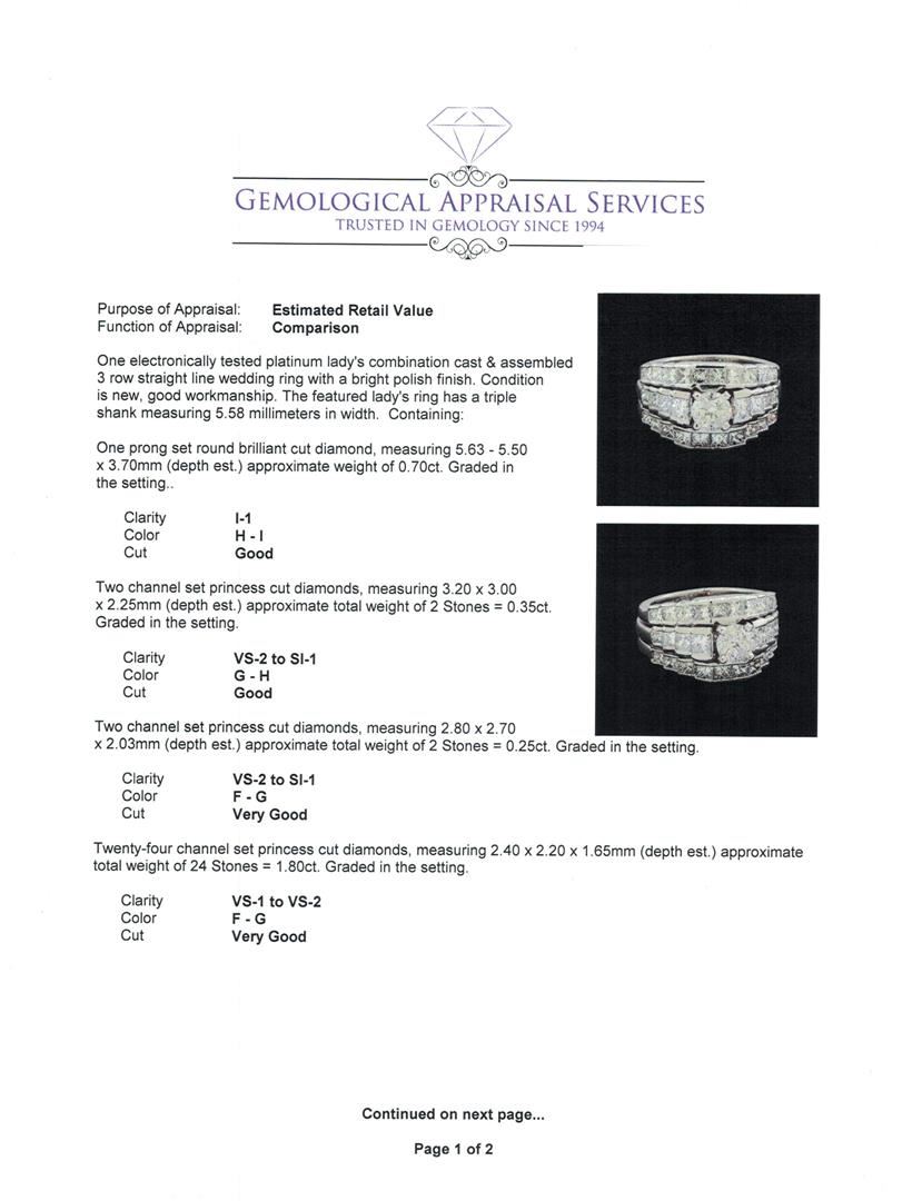 One electronically tested platinum lady's combination cast & assembled 3 row straight line wedding ring with a bright polish finish. The featured lady's ring has a triple shank measuring 5.58 millimeters in width. Condition is new, good workmanship. Containing: One prong set round brilliant cut diamond, measuring 5.63 - 5.50 x 3.70mm (depth est.) approximate weight of 0.70ct. Graded in the setting. Clarity: I-1. Color: H - I. Cut Good Two channel set princess cut diamonds, measuring 3.20 x 3.00 x 2.25mm (depth est.) approximate total weight of 2 Stones = 0.35ct. Graded in the setting. Clarity: VS-2 to SI-1. Color: G - Good Two channel set princess cut diamonds, measuring 2.80 x 2.70 x 2.03mm (depth est.) approximate total weight of 2 Stones = 0.25ct. Graded in the setting. Clarity: VS-2 to SI-1. Color: F - Very Good Twenty-Four channel set princess cut diamonds, measuring 2.40 x 2.20 x 1.65mm (depth est.) approximate total weight of 24 Stones = 1.80ct. Graded in the setting. Clarity: VS-1 to VS-2. Color: F - Very Good. Total Weight of Diamonds 3.10ct. Total Weight of Ring 19.10gm. GAS Appraised at $13,050.00.