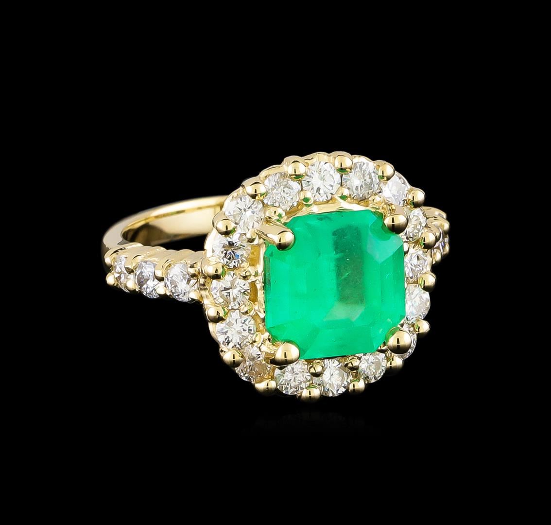 One electronically tested 14KT yellow gold lady's cast fashion ring with a cushion basket halo with a bright polish finish. The featured lady's ring has a shank measuring 2.27 millimeters in width. Identified with markings of "14K". Condition is new, good workmanship. Containing: One prong set square emerald step cut natural emerald, measuring 8.69 x 8.66 x 6.21mm, (depth est.) 3%. bulge factor, approximate weight of 3.10ct., clarity is moderately included, medium light, moderately strong, green color, (GIA G 4/4), cut is very good. Transmitting light with a minimum of distortion, transparent. Colored gemstones are presumed to have been subjected to commonly used enhancement processes. Indications of oil residue. Graded in the setting. Twenty-Two prong set round brilliant cut diamonds, measuring 2.40 - 2.35 x 1.46mm (depth est.) approximate total weight of 22 Stones = 1.08ct. Graded in the setting. Clarity: SI-1 to SI-2. Color: H - I. Cut Good. Total Weight of Colored Stones 3.10ct. Total Weight of Diamonds 1.08ct. Total Weight of Ring 6.80gm GAS Appraised at $8,575.00.