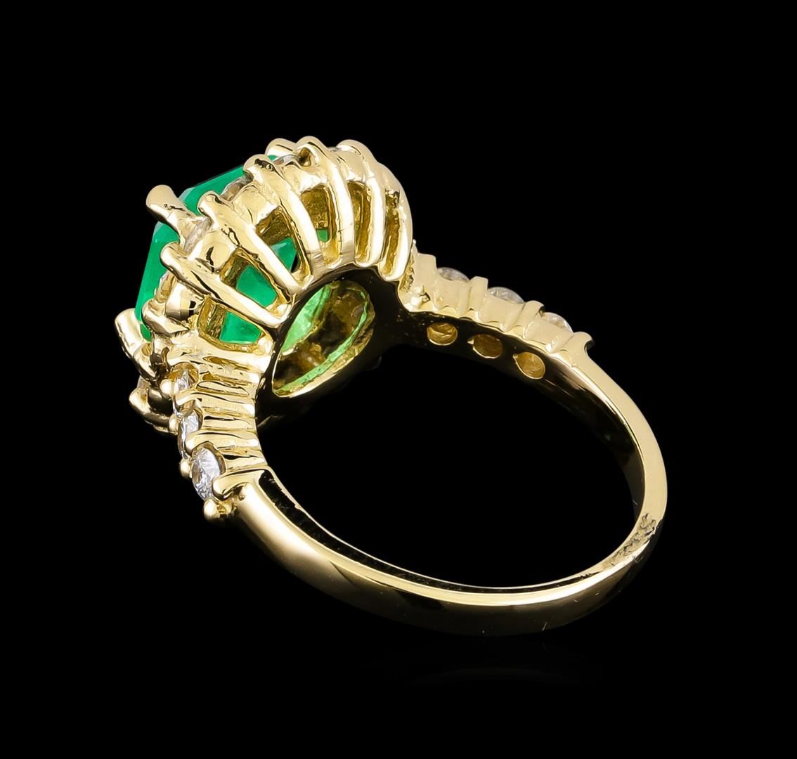 One electronically tested 14KT yellow gold lady's cast fashion ring with a cushion basket halo with a bright polish finish. The featured lady's ring has a shank measuring 2.27 millimeters in width. Identified with markings of "14K". Condition is new, good workmanship. Containing: One prong set square emerald step cut natural emerald, measuring 8.69 x 8.66 x 6.21mm, (depth est.) 3%. bulge factor, approximate weight of 3.10ct., clarity is moderately included, medium light, moderately strong, green color, (GIA G 4/4), cut is very good. Transmitting light with a minimum of distortion, transparent. Colored gemstones are presumed to have been subjected to commonly used enhancement processes. Indications of oil residue. Graded in the setting. Twenty-Two prong set round brilliant cut diamonds, measuring 2.40 - 2.35 x 1.46mm (depth est.) approximate total weight of 22 Stones = 1.08ct. Graded in the setting. Clarity: SI-1 to SI-2. Color: H - I. Cut Good. Total Weight of Colored Stones 3.10ct. Total Weight of Diamonds 1.08ct. Total Weight of Ring 6.80gm GAS Appraised at $8,575.00.