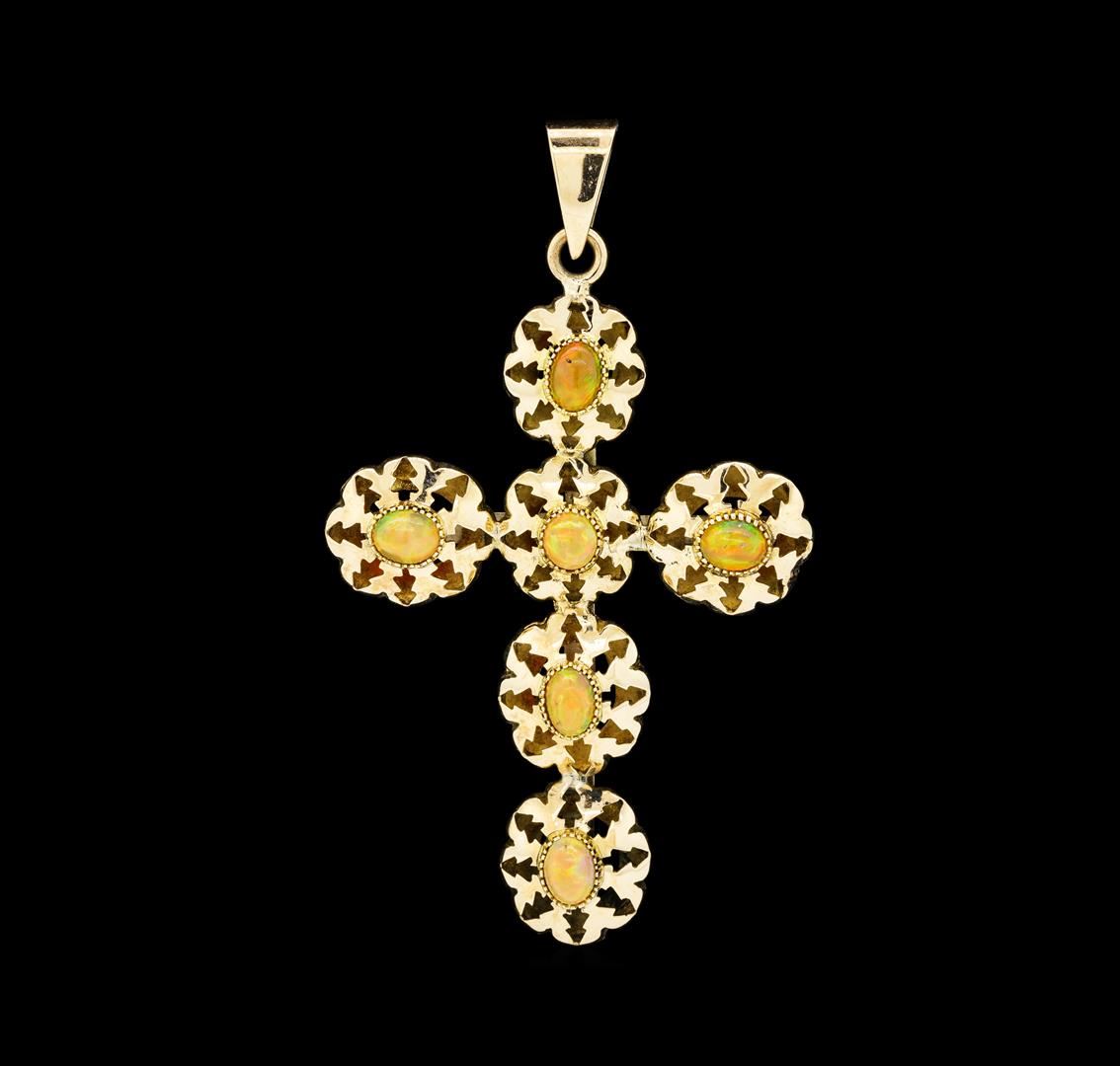 One electronically tested 14KT yellow and white gold lady's hand fabricated fashion cross pendant with a bright polish with milgrain detailing finish. Identified with markings of '14K'. Condition is like new, good workmanship. Containing: Five fire opals that are cut in a oval shaped cabochon and are prong set, measuring 5.60 mm long x 4.10 mm wide, and 3.02 mm thick and the approximate weight is 2.60 carats. The opals have a somewhat bright, orange-green play of color (fire) in a rolling flashfire pattern; a medium dome; a good cut; no inclusions; consistent in their brightness and pattern; and are not directional. Graded in the setting. One fire opal that is cut in a round shaped cabochon and is prong set, measuring 5.00 mm long x 4.95 mm wide, and 3.09 mm thick and the approximate weight is 0.50 carats. The opal has a somewhat bright, orange-green play of color (fire) in a rolling flashfire pattern; a high dome; a good cut; no inclusions; consistent in its brightness and pattern; and is not directional. Graded in the setting.. Total Weight of Opals 3.10ct.. Total Weight of Pendant 9.70gm GAS Appraised at $2,350.00.