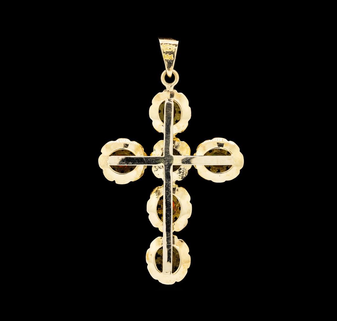 One electronically tested 14KT yellow and white gold lady's hand fabricated fashion cross pendant with a bright polish with milgrain detailing finish. Identified with markings of '14K'. Condition is like new, good workmanship. Containing: Five fire opals that are cut in a oval shaped cabochon and are prong set, measuring 5.60 mm long x 4.10 mm wide, and 3.02 mm thick and the approximate weight is 2.60 carats. The opals have a somewhat bright, orange-green play of color (fire) in a rolling flashfire pattern; a medium dome; a good cut; no inclusions; consistent in their brightness and pattern; and are not directional. Graded in the setting. One fire opal that is cut in a round shaped cabochon and is prong set, measuring 5.00 mm long x 4.95 mm wide, and 3.09 mm thick and the approximate weight is 0.50 carats. The opal has a somewhat bright, orange-green play of color (fire) in a rolling flashfire pattern; a high dome; a good cut; no inclusions; consistent in its brightness and pattern; and is not directional. Graded in the setting.. Total Weight of Opals 3.10ct.. Total Weight of Pendant 9.70gm GAS Appraised at $2,350.00.