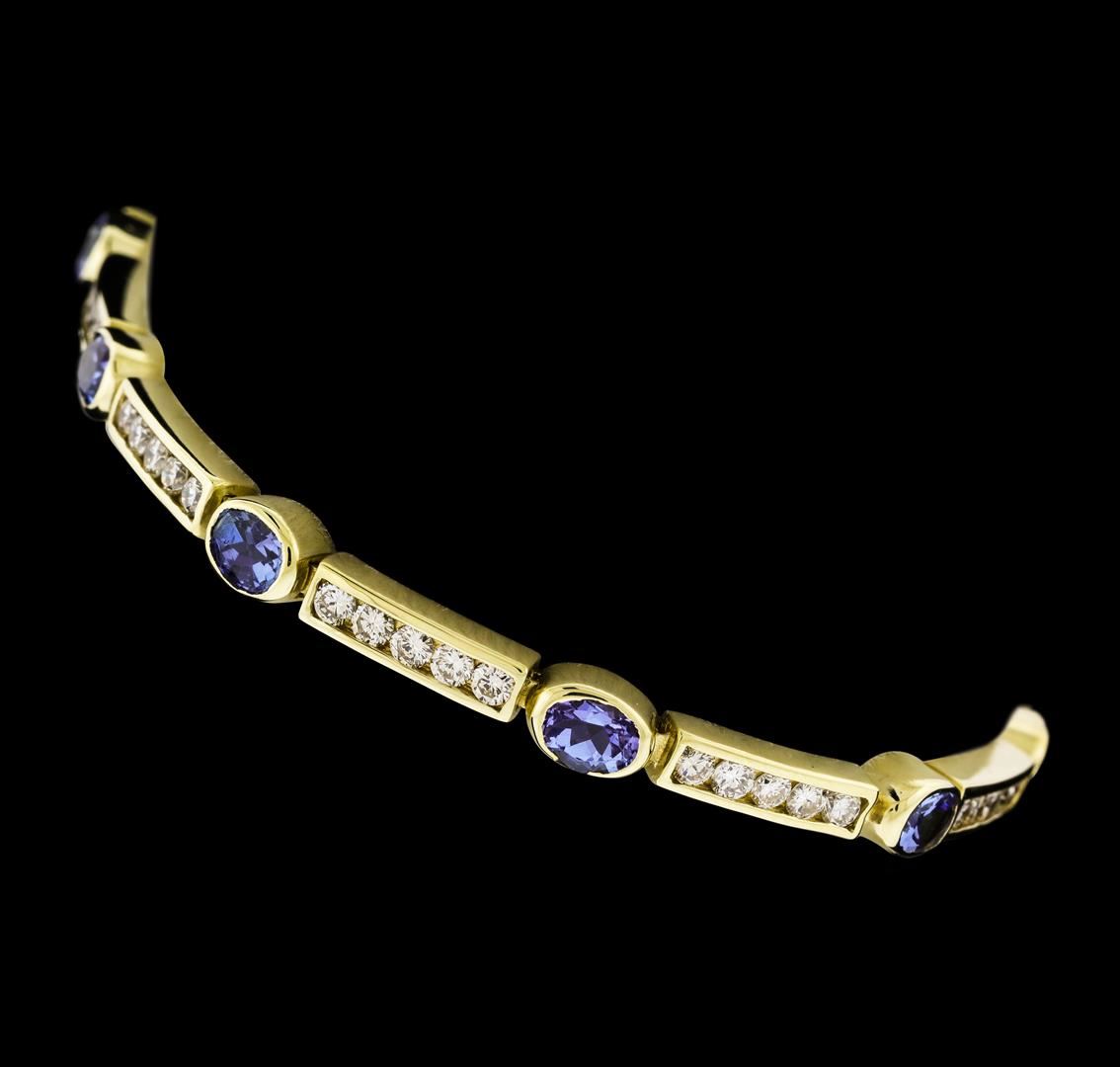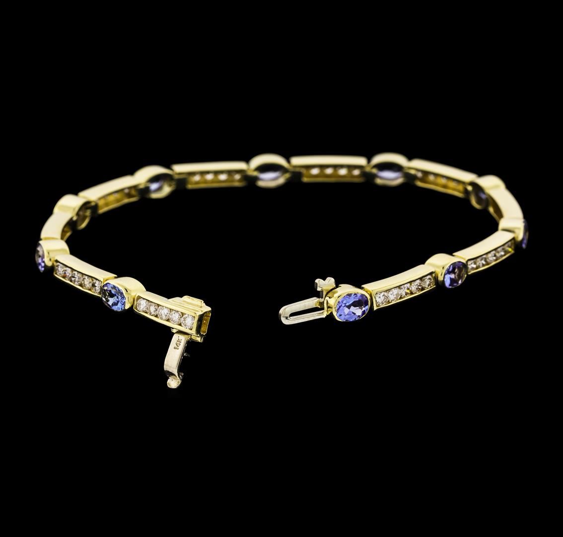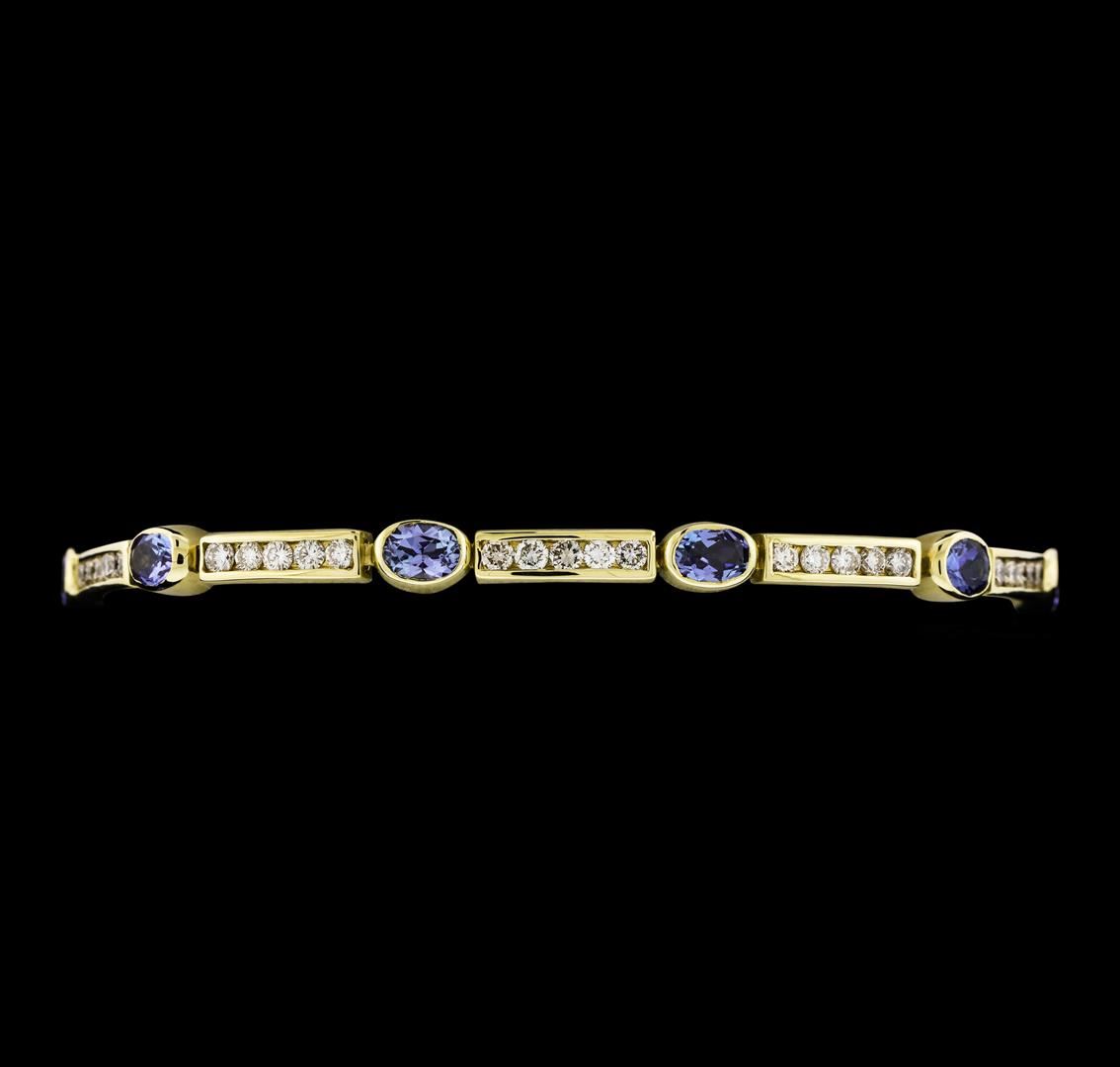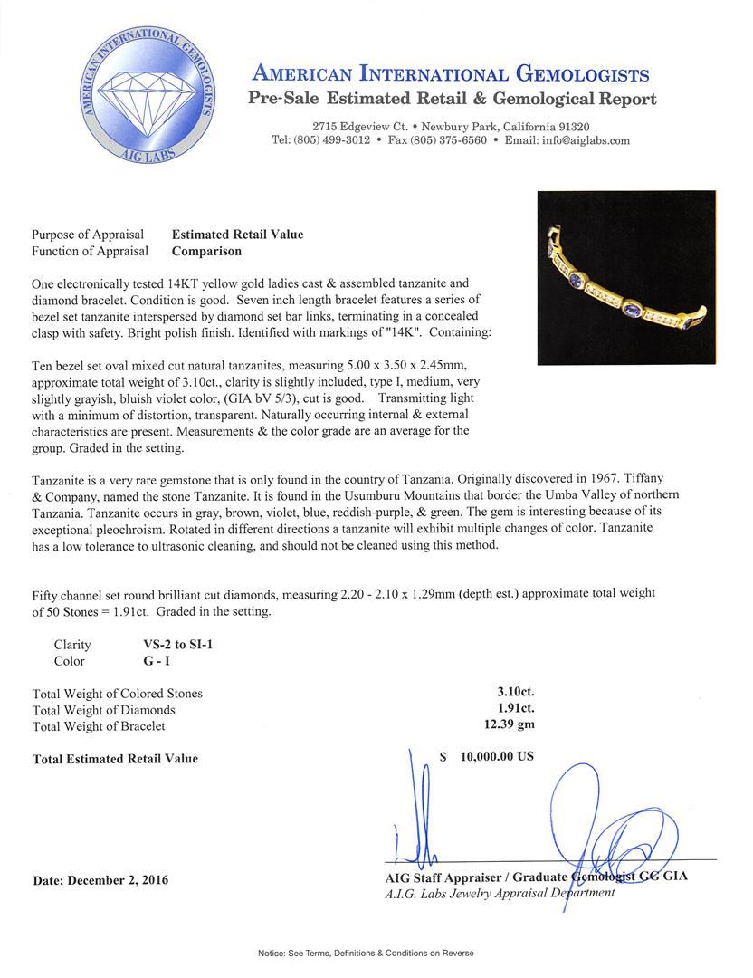 One electronically tested 14KT yellow gold ladies cast & assembled tanzanite and diamond bracelet. Seven inch length bracelet features a series of bezel set tanzanite interspersed by diamond set bar links, terminating in a concealed clasp with safety. Bright polish finish. Identified with markings of '14K'. Condition is good. Containing: Ten bezel set oval mixed cut natural tanzanites, measuring 5.00 x 3.50 x 2.45mm, approximate total weight of 3.10ct., clarity is slightly included, type I, medium, very slightly grayish, bluish violet color, (GIA bV 5/3), cut is good. Transmitting light with a minimum of distortion, transparent. Naturally occurring internal & external characteristics are present. Measurements & the color grade are an average for the group. Graded in the setting. Tanzanite is a very rare gemstone that is only found in the country of Tanzania. Originally discovered in 1967. Tiffany & Company, named the stone Tanzanite. It is found in the Usumburu Mountains that border the Umba Valley of northern Tanzania. Tanzanite occurs in gray, brown, violet, blue, reddish-purple, & green. The gem is interesting because of its exceptional pleochroism. Rotated in different directions a tanzanite will exhibit multiple changes of color. Tanzanite has a low tolerance to ultrasonic cleaning, and should not be cleaned using this method. Fifty channel set round brilliant cut diamonds, measuring 2.20 - 2.10 x 1.29mm (depth est.) approximate total weight of 50 Stones = 1.91ct. Graded in the setting. Clarity VS-2 to SI-1. Color: G - I. Total Weight of Colored Stones 3.10ct.. Total Weight of Diamonds 1.91ct.. Total Weight of Bracelet 12.39gm. AIG Appraised at $7,500.00.
