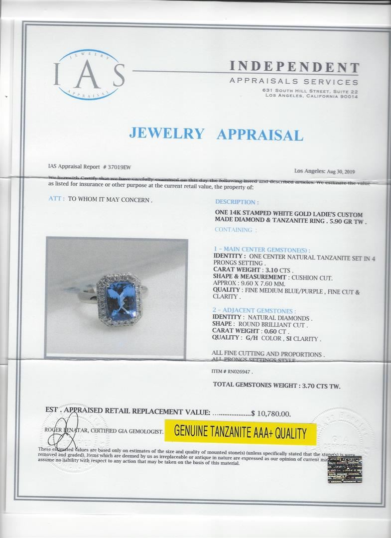 One 3.10ct Tanzanite and Diamond Ring - 14KT White Gold. IAS certified. See Appraisal for more details.