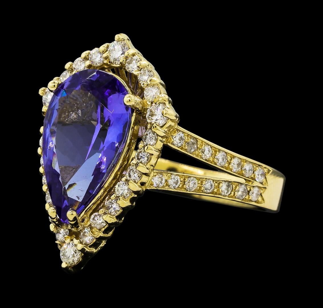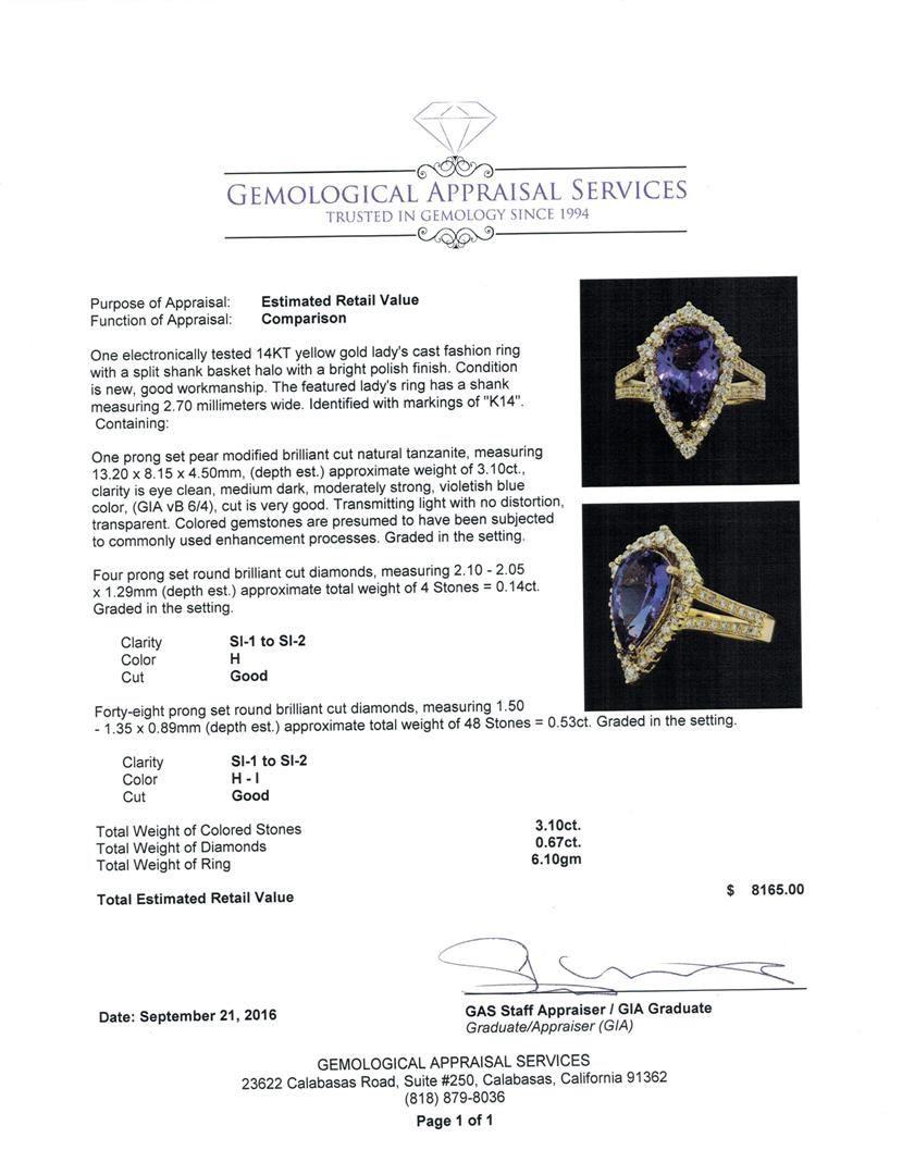 One electronically tested 14KT yellow gold lady's cast fashion ring with a split shank basket halo with a bright polish finish. The featured lady's ring has a shank measuring 2.70 millimeters wide. Identified with markings of 'K14'. Condition is new, good workmanship. Containing: One prong set pear modified brilliant cut natural tanzanite, measuring 13.20 x 8.15 x 4.50mm, (depth est.) approximate weight of 3.10ct., clarity is eye clean, medium dark, moderately strong, violetish blue color, (GIA vB 6/4), cut is very good. Transmitting light with no distortion, transparent. Colored gemstones are presumed to have been subjected to commonly used enhancement processes. Graded in the setting. Four prong set round brilliant cut diamonds, measuring 2.10 - 2.05 x 1.29mm (depth est.) approximate total weight of 4 Stones = 0.14ct. Graded in the setting. Clarity SI-1 to SI-2. Color: H Cut Good Forty-Eight prong set round brilliant cut diamonds, measuring 1.50 - 1.35 x 0.89mm (depth est.) approximate total weight of 48 Stones = 0.53ct. Graded in the setting. Clarity SI-1 to SI-2. Color: H - I Cut Good. Total Weight of Colored Stones 3.10ct.. Total Weight of Diamonds 0.67ct.. Total Weight of Ring 6.10gm. GAS Appraised at $8,165.00.