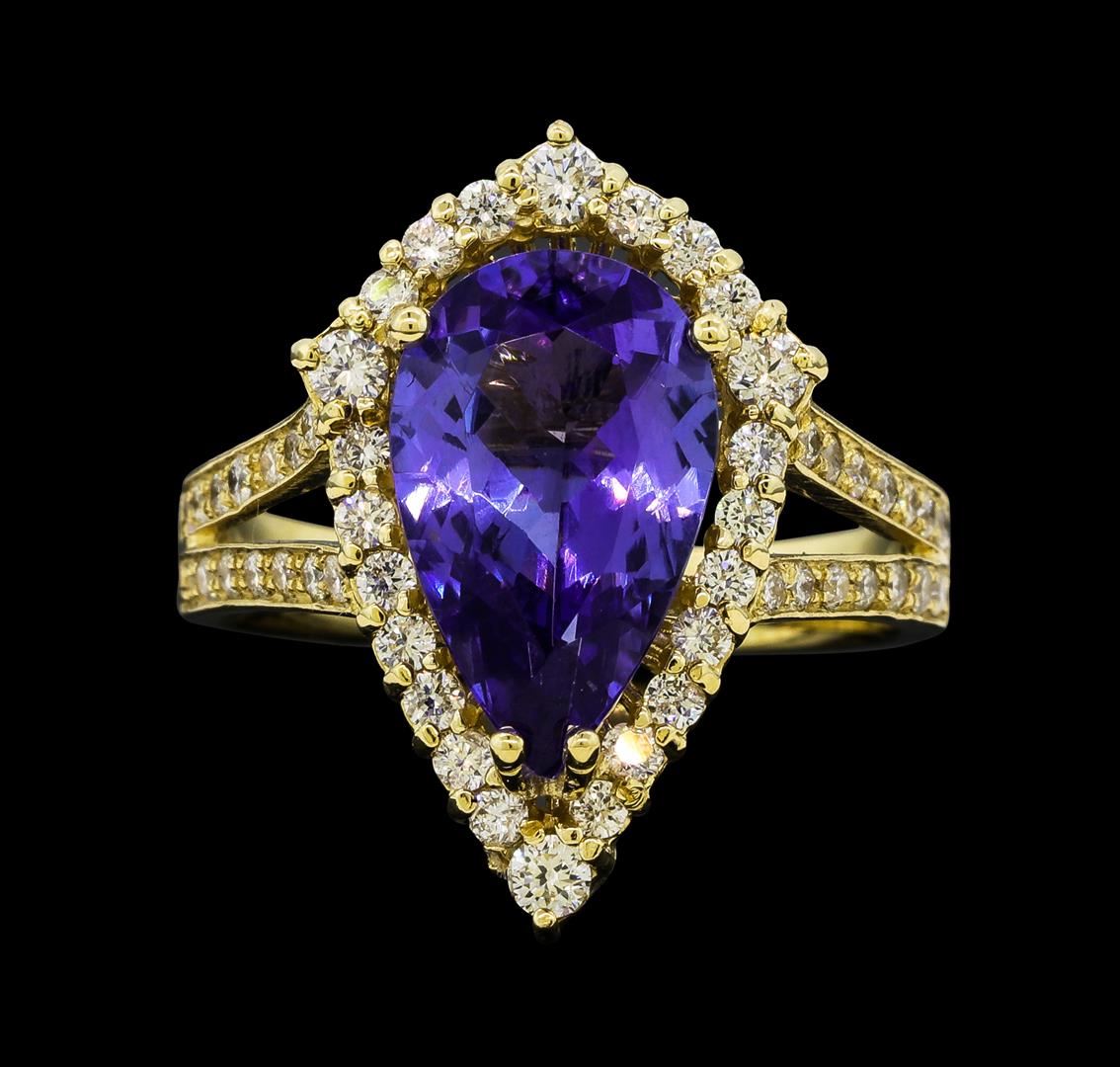 One electronically tested 14KT yellow gold lady's cast fashion ring with a split shank basket halo with a bright polish finish. The featured lady's ring has a shank measuring 2.70 millimeters wide. Identified with markings of 'K14'. Condition is new, good workmanship. Containing: One prong set pear modified brilliant cut natural tanzanite, measuring 13.20 x 8.15 x 4.50mm, (depth est.) approximate weight of 3.10ct., clarity is eye clean, medium dark, moderately strong, violetish blue color, (GIA vB 6/4), cut is very good. Transmitting light with no distortion, transparent. Colored gemstones are presumed to have been subjected to commonly used enhancement processes. Graded in the setting. Four prong set round brilliant cut diamonds, measuring 2.10 - 2.05 x 1.29mm (depth est.) approximate total weight of 4 Stones = 0.14ct. Graded in the setting. Clarity SI-1 to SI-2. Color: H Cut Good Forty-Eight prong set round brilliant cut diamonds, measuring 1.50 - 1.35 x 0.89mm (depth est.) approximate total weight of 48 Stones = 0.53ct. Graded in the setting. Clarity SI-1 to SI-2. Color: H - I Cut Good. Total Weight of Colored Stones 3.10ct.. Total Weight of Diamonds 0.67ct.. Total Weight of Ring 6.10gm. GAS Appraised at $8,165.00.