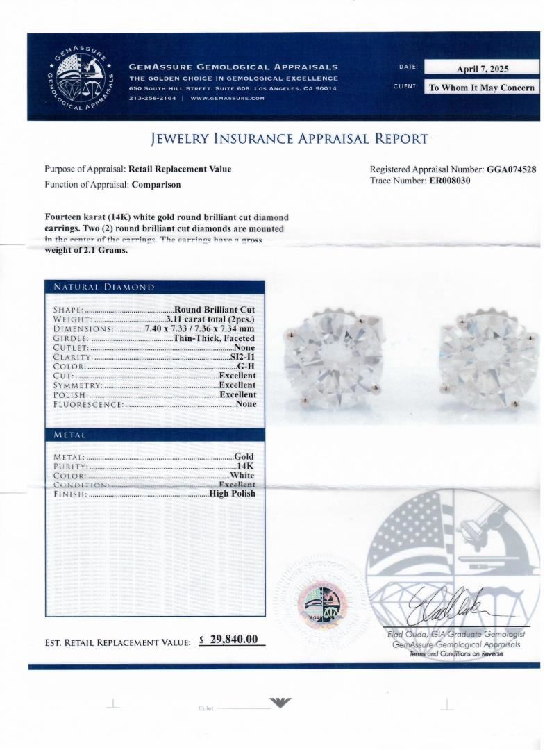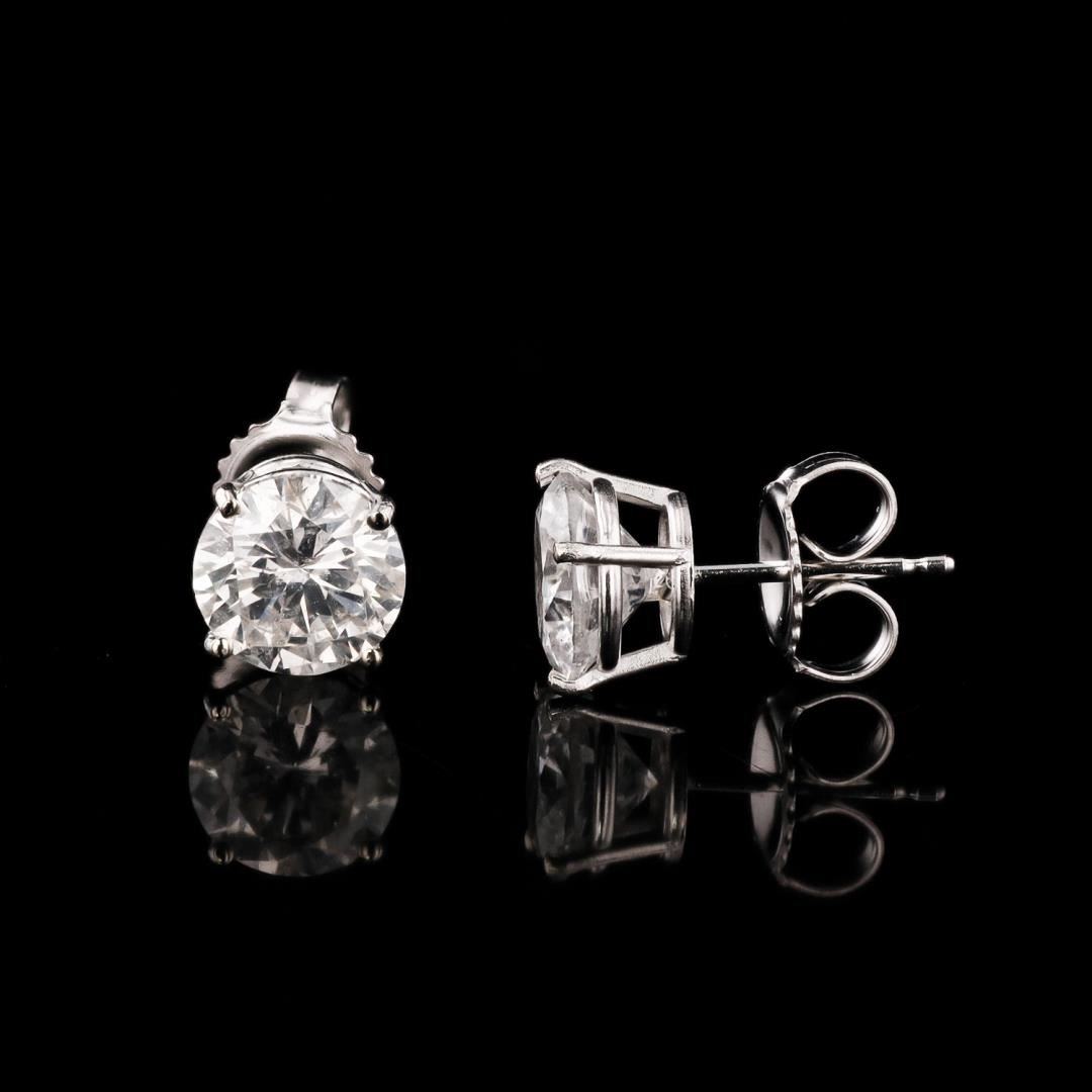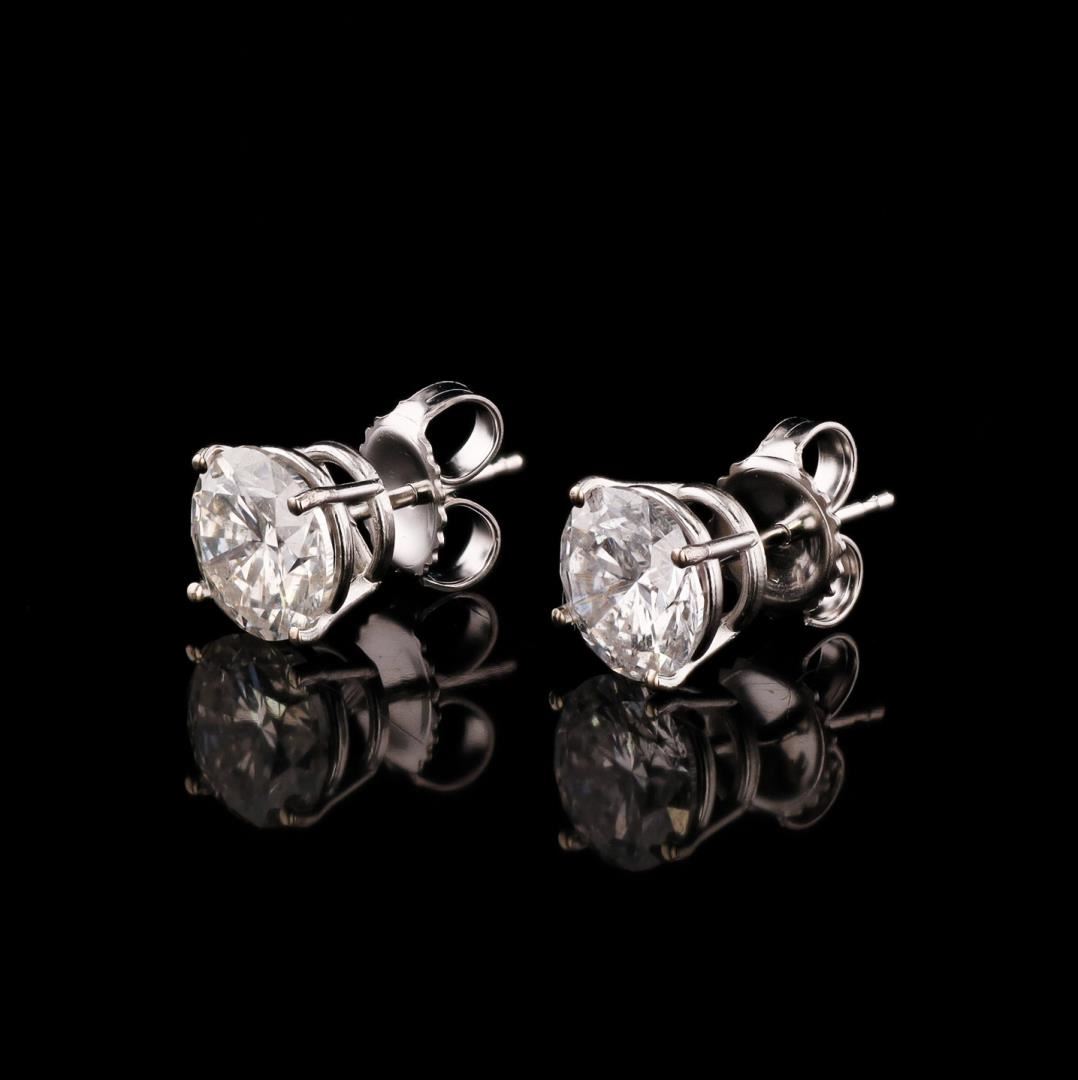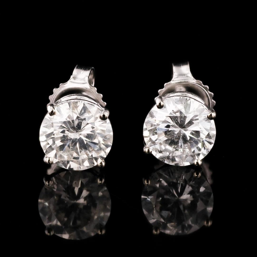 Fourteen karat (14K) white gold round brilliant cut diamond earrings. Two (2) round brilliant cut diamonds are mounted in the center of the earrings. The earrings have a gross weight of 2.1 Grams. #NATURAL DIAMOND# SHAPE: Round Brilliant Cut WEIGHT: 3.11 carat total (2pcs.) DIMENSIONS: 7.40 x 7.33 / 7.36 x 7.34mm GIRDLE: Thin-Thick, Faceted CUTLET: None CLARITY: SI2-I1 COLOR: G-H CUT: Excellent SYMMETRY: Excellent POLISH: Excellent FLUORESCENCE: None #METAL# METAL: Gold PURITY: 14K COLOR: White CONDITION: Excellent FINISH: High Polish