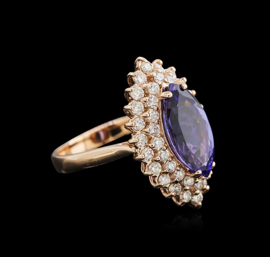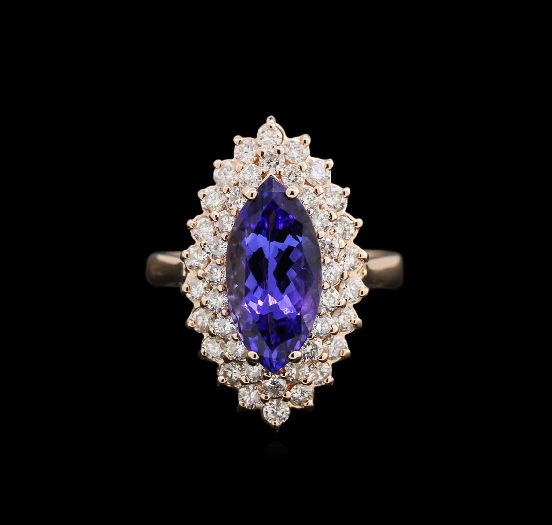 One electronically tested 14KT rose gold lady's cast fashion ring with a double halo with a bright polish finish. The featured lady's ring has a basket motif with a shank measuring 2.83 millimeters wide. Identified with markings of "K14". Condition is new, good workmanship. Containing: One prong set marquise modified brilliant cut natural tanzanite, measuring 14.20 x 6.91 x 4.88mm, approximate weight of 3.11ct., clarity is eye clean, type I, medium dark, moderately strong, violetish blue color, (GIA vB 6/4), cut is very good. Transmitting light with no distortion, transparent. Colored gemstones are presumed to have been subjected to commonly used enhancement processes. Graded in the setting. Forty-Two prong set round brilliant cut diamonds, measuring 1.90 - 1.85 x 1.20mm (depth est.) approximate total weight of 42 Stones = 1.08ct. Graded in the setting. Clarity: SI-1 to I-1. Color: H - I. Cut Good. Total Weight of Colored Stones 3.11ct. Total Weight of Diamonds 1.08ct. Total Weight of Ring 6.50gm. GAS Appraised at $7,820.00.