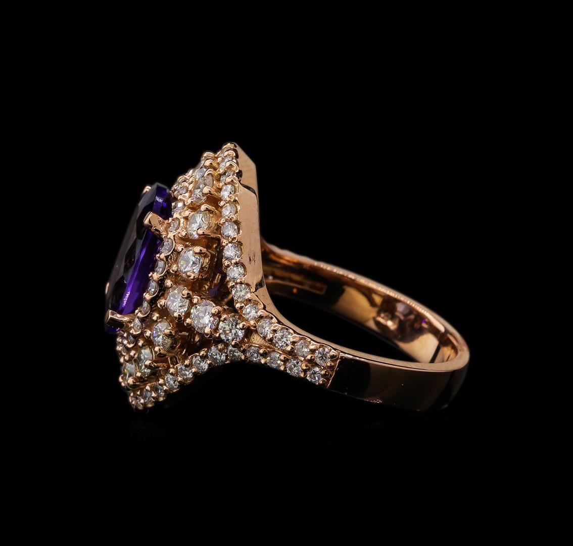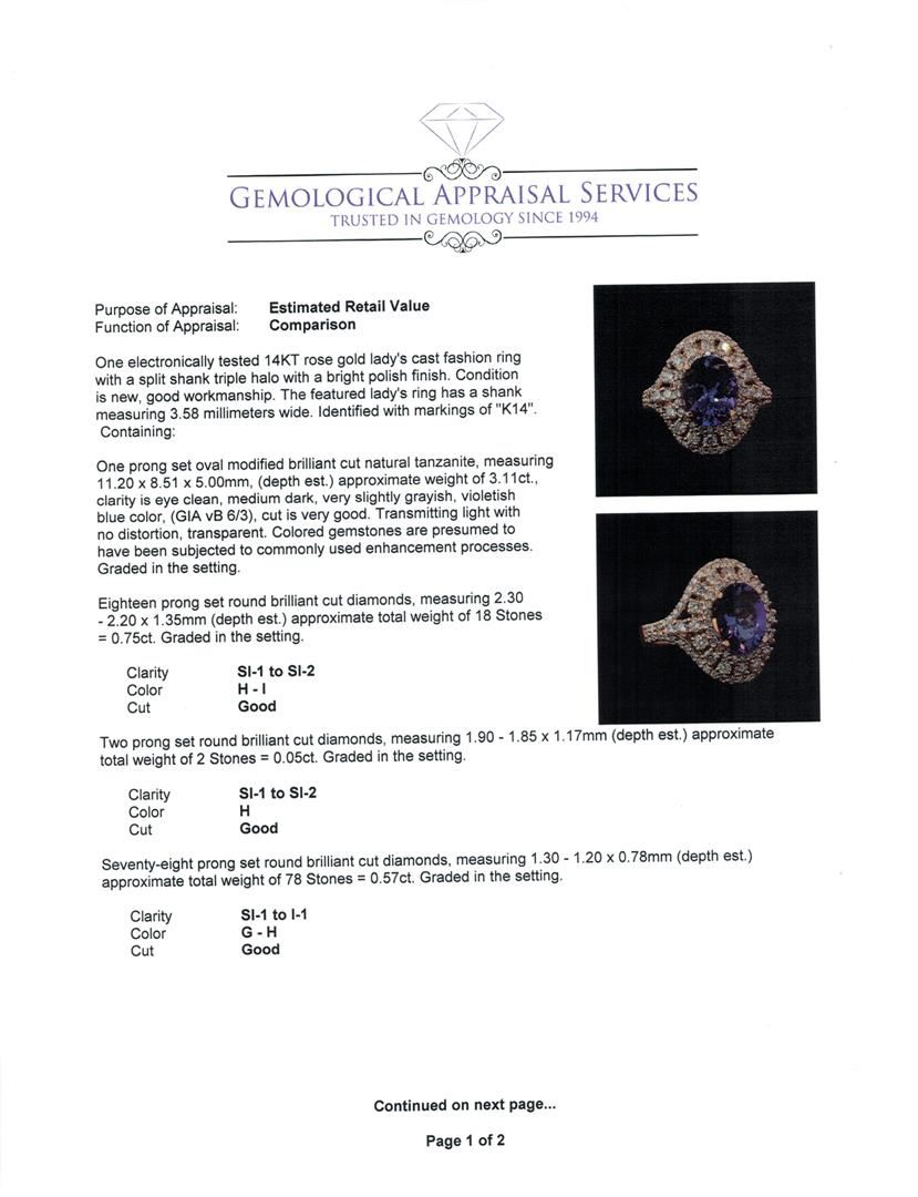 One electronically tested 14KT rose gold lady's cast fashion ring with a split shank triple halo with a bright polish finish. The featured lady's ring has a shank measuring 3.58 millimeters wide. Identified with markings of 'K14'. Condition is new, good workmanship. Containing: One prong set oval modified brilliant cut natural tanzanite, measuring 11.20 x 8.51 x 5.00mm, (depth est.) approximate weight of 3.11ct., clarity is eye clean, medium dark, very slightly grayish, violetish blue color, (GIA vB 6/3), cut is very good. Transmitting light with no distortion, transparent. Colored gemstones are presumed to have been subjected to commonly used enhancement processes. Graded in the setting. Eighteen prong set round brilliant cut diamonds, measuring 2.30 - 2.20 x 1.35mm (depth est.) approximate total weight of 18 Stones = 0.75ct. Graded in the setting. Clarity SI-1 to SI-2. Color: H - I Cut Good Two prong set round brilliant cut diamonds, measuring 1.90 - 1.85 x 1.17mm (depth est.) approximate total weight of 2 Stones = 0.05ct. Graded in the setting. Clarity SI-1 to SI-2. Color: H Cut Good Seventy-Eight prong set round brilliant cut diamonds, measuring 1.30 - 1.20 x 0.78mm (depth est.) approximate total weight of 78 Stones = 0.57ct. Graded in the setting. Clarity SI-1 to I-1. Color: G - H Cut Good. Total Weight of Colored Stones 3.11ct. Total Weight of Diamonds 1.37ct. Total Weight of Ring 8.10gm. GAS Appraised at $10,170.00.