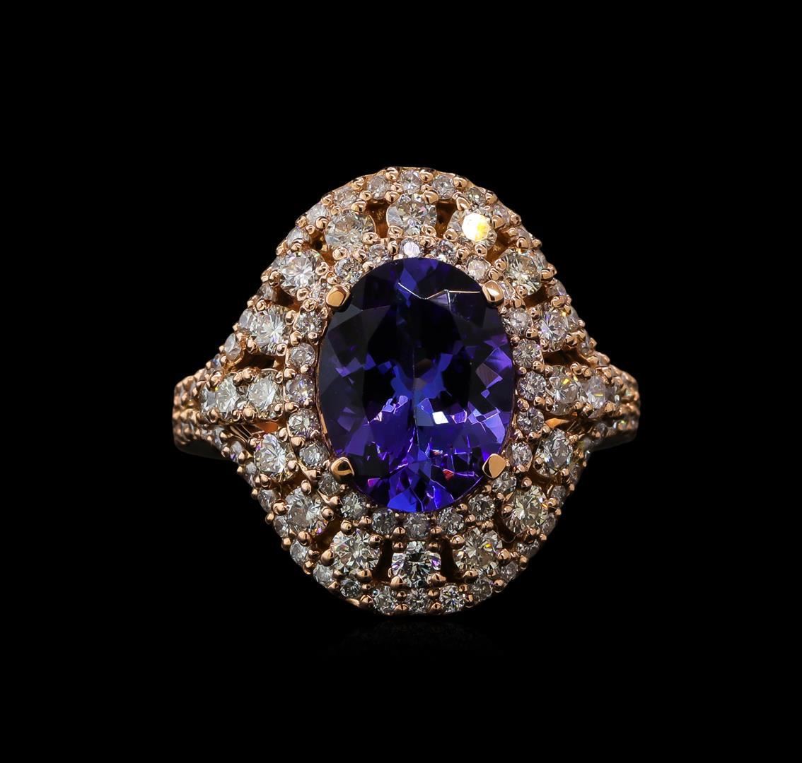 One electronically tested 14KT rose gold lady's cast fashion ring with a split shank triple halo with a bright polish finish. The featured lady's ring has a shank measuring 3.58 millimeters wide. Identified with markings of 'K14'. Condition is new, good workmanship. Containing: One prong set oval modified brilliant cut natural tanzanite, measuring 11.20 x 8.51 x 5.00mm, (depth est.) approximate weight of 3.11ct., clarity is eye clean, medium dark, very slightly grayish, violetish blue color, (GIA vB 6/3), cut is very good. Transmitting light with no distortion, transparent. Colored gemstones are presumed to have been subjected to commonly used enhancement processes. Graded in the setting. Eighteen prong set round brilliant cut diamonds, measuring 2.30 - 2.20 x 1.35mm (depth est.) approximate total weight of 18 Stones = 0.75ct. Graded in the setting. Clarity SI-1 to SI-2. Color: H - I Cut Good Two prong set round brilliant cut diamonds, measuring 1.90 - 1.85 x 1.17mm (depth est.) approximate total weight of 2 Stones = 0.05ct. Graded in the setting. Clarity SI-1 to SI-2. Color: H Cut Good Seventy-Eight prong set round brilliant cut diamonds, measuring 1.30 - 1.20 x 0.78mm (depth est.) approximate total weight of 78 Stones = 0.57ct. Graded in the setting. Clarity SI-1 to I-1. Color: G - H Cut Good. Total Weight of Colored Stones 3.11ct. Total Weight of Diamonds 1.37ct. Total Weight of Ring 8.10gm. GAS Appraised.