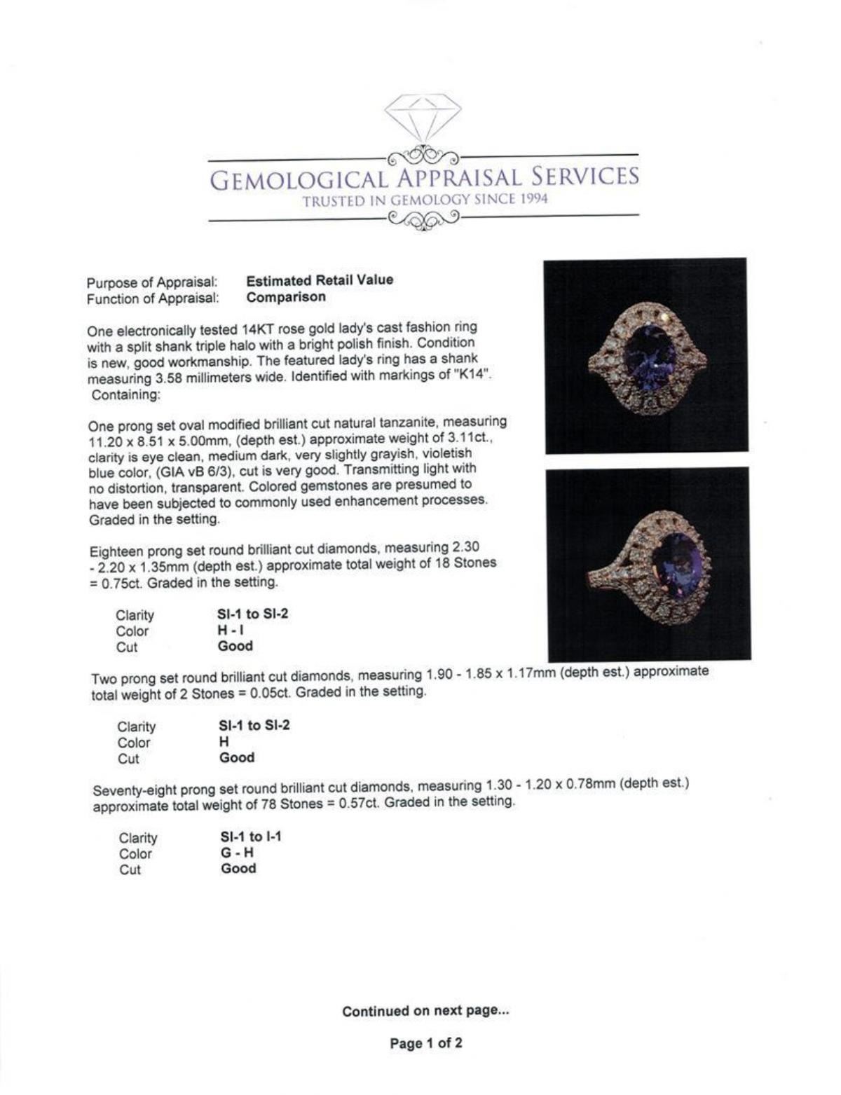 One electronically tested 14KT rose gold lady's cast fashion ring with a split shank triple halo with a bright polish finish. The featured lady's ring has a shank measuring 3.58 millimeters wide. Identified with markings of 'K14'. Condition is new, good workmanship. Containing: One prong set oval modified brilliant cut natural tanzanite, measuring 11.20 x 8.51 x 5.00mm, (depth est.) approximate weight of 3.11ct., clarity is eye clean, medium dark, very slightly grayish, violetish blue color, (GIA vB 6/3), cut is very good. Transmitting light with no distortion, transparent. Colored gemstones are presumed to have been subjected to commonly used enhancement processes. Graded in the setting. Eighteen prong set round brilliant cut diamonds, measuring 2.30 - 2.20 x 1.35mm (depth est.) approximate total weight of 18 Stones = 0.75ct. Graded in the setting. Clarity SI-1 to SI-2. Color: H - I Cut Good Two prong set round brilliant cut diamonds, measuring 1.90 - 1.85 x 1.17mm (depth est.) approximate total weight of 2 Stones = 0.05ct. Graded in the setting. Clarity SI-1 to SI-2. Color: H Cut Good Seventy-Eight prong set round brilliant cut diamonds, measuring 1.30 - 1.20 x 0.78mm (depth est.) approximate total weight of 78 Stones = 0.57ct. Graded in the setting. Clarity SI-1 to I-1. Color: G - H Cut Good. Total Weight of Colored Stones 3.11ct. Total Weight of Diamonds 1.37ct. Total Weight of Ring 8.10gm. GAS Appraised.