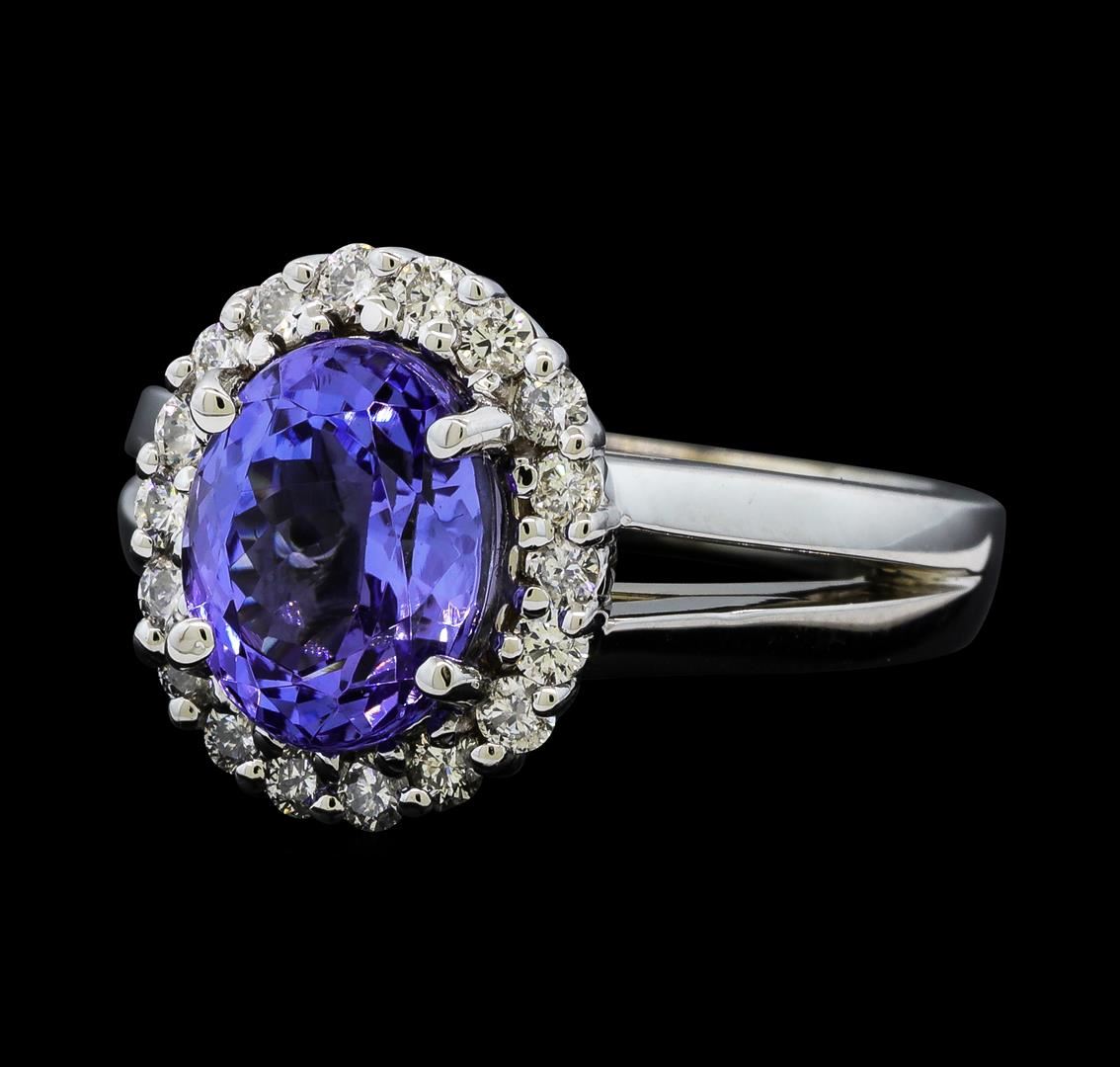 One electronically tested 14KT white gold lady's cast fashion ring with a split shank basket halo with a bright polish finish. The featured lady's ring has a shank measuring 2.65 millimeters wide. Identified with markings of '14K'. Condition is new, good workmanship. Containing: One prong set oval modified brilliant cut natural tanzanite, measuring 9.68 x 7.69 x 5.50mm, (depth est.) 8%. bulge factor, approximate weight of 3.11ct., clarity is eye clean, medium, moderately strong, violet color, (GIA V 5/4), cut is very good. Transmitting light with no distortion, transparent. Colored gemstones are presumed to have been subjected to commonly used enhancement processes. Graded in the setting. Eighteen prong set round brilliant cut diamonds, measuring 1.90 - 1.85 x 1.17mm (depth est.) approximate total weight of 18 Stones = 0.46ct. Graded in the setting. Clarity SI-1 to SI-2. Color: G - H Cut Good. Total Weight of Colored Stones 3.11ct.. Total Weight of Diamonds 0.46ct.. Total Weight of Ring 7.30gm. GAS Appraised at $7,030.00.