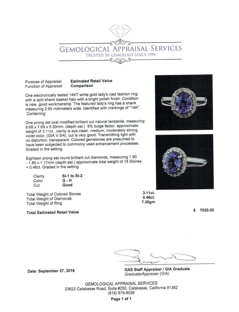 One electronically tested 14KT white gold lady's cast fashion ring with a split shank basket halo with a bright polish finish. The featured lady's ring has a shank measuring 2.65 millimeters wide. Identified with markings of '14K'. Condition is new, good workmanship. Containing: One prong set oval modified brilliant cut natural tanzanite, measuring 9.68 x 7.69 x 5.50mm, (depth est.) 8%. bulge factor, approximate weight of 3.11ct., clarity is eye clean, medium, moderately strong, violet color, (GIA V 5/4), cut is very good. Transmitting light with no distortion, transparent. Colored gemstones are presumed to have been subjected to commonly used enhancement processes. Graded in the setting. Eighteen prong set round brilliant cut diamonds, measuring 1.90 - 1.85 x 1.17mm (depth est.) approximate total weight of 18 Stones = 0.46ct. Graded in the setting. Clarity SI-1 to SI-2. Color: G - H Cut Good. Total Weight of Colored Stones 3.11ct.. Total Weight of Diamonds 0.46ct.. Total Weight of Ring 7.30gm.