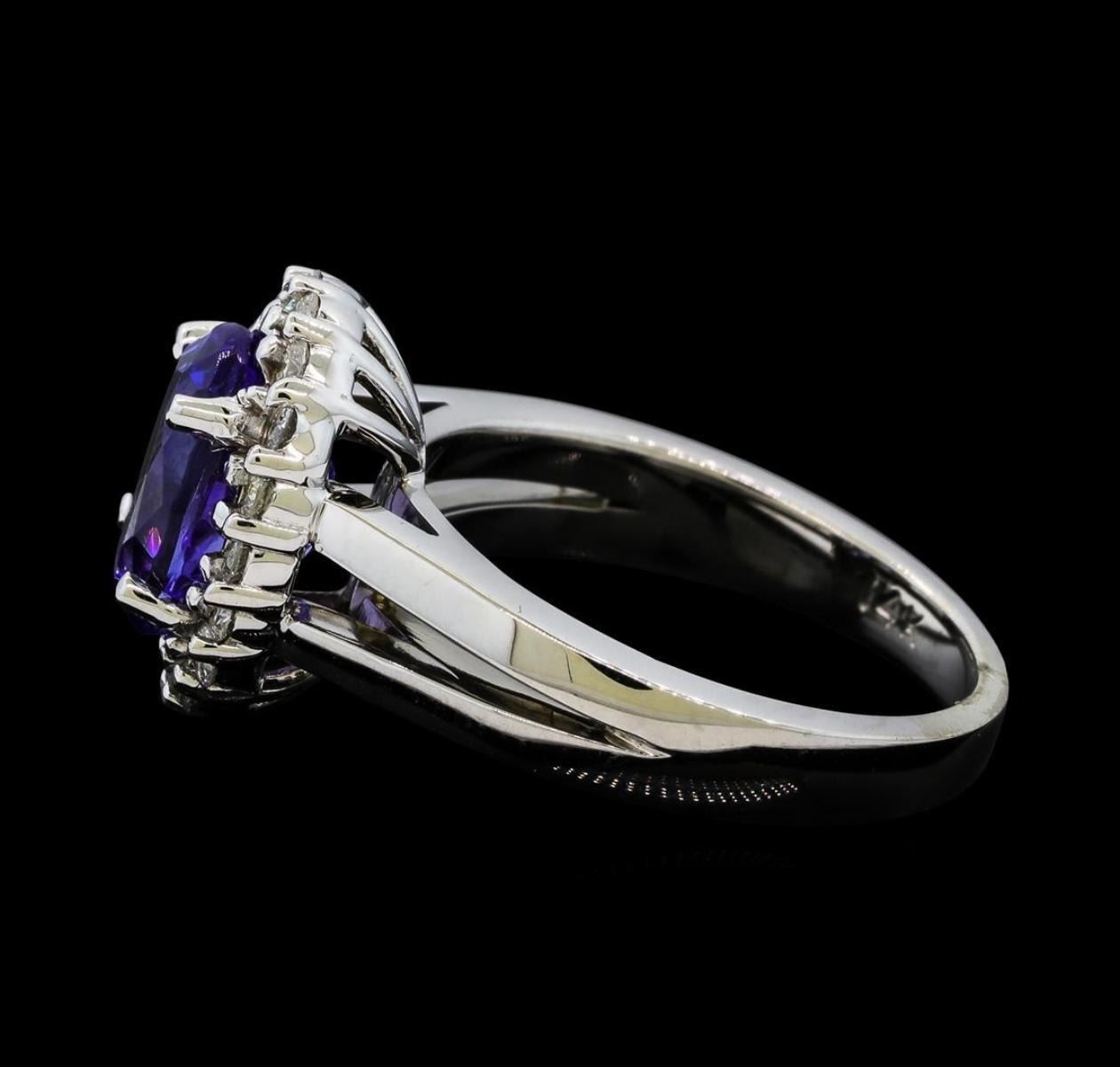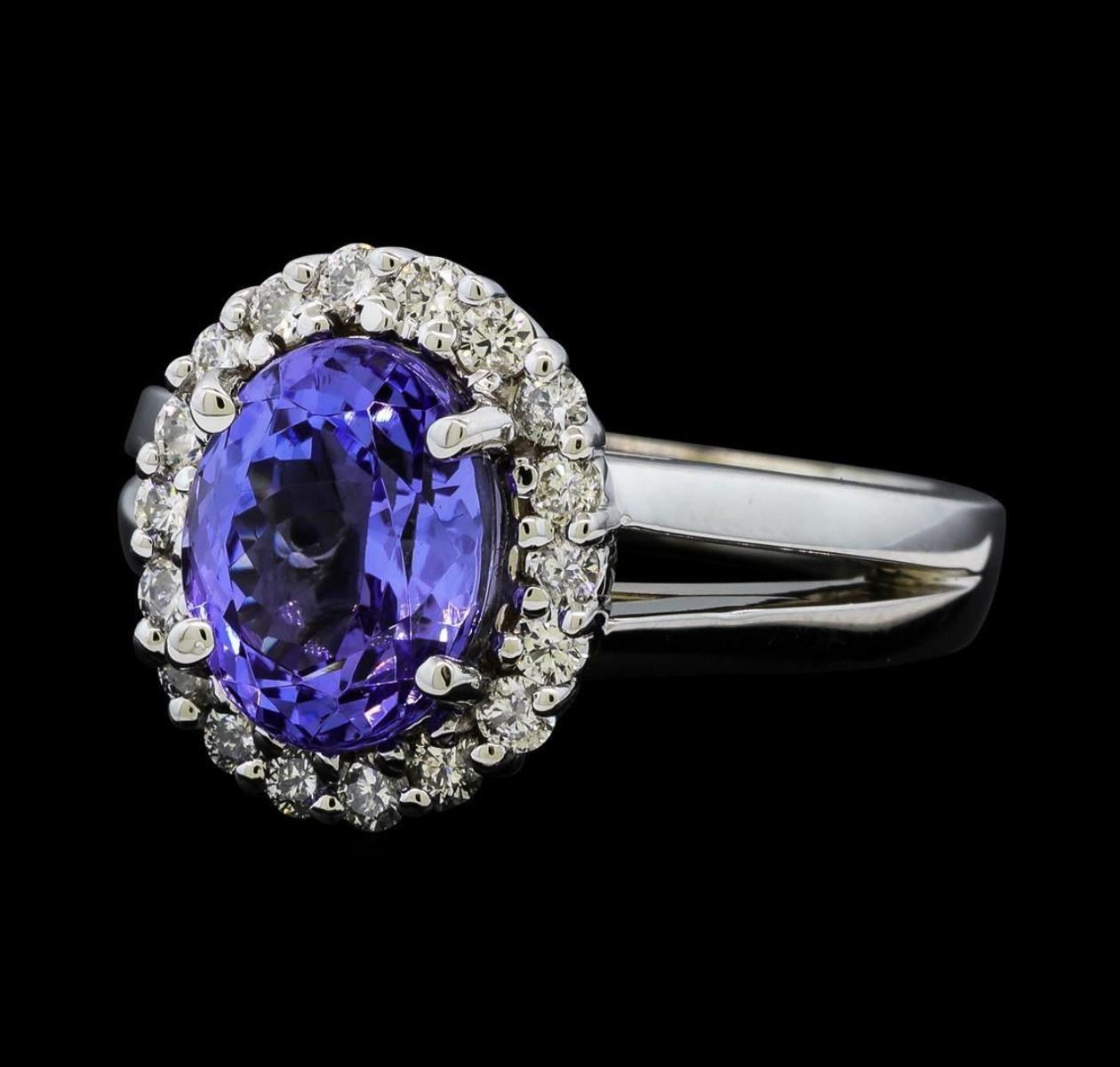 One electronically tested 14KT white gold lady's cast fashion ring with a split shank basket halo with a bright polish finish. The featured lady's ring has a shank measuring 2.65 millimeters wide. Identified with markings of '14K'. Condition is new, good workmanship. Containing: One prong set oval modified brilliant cut natural tanzanite, measuring 9.68 x 7.69 x 5.50mm, (depth est.) 8%. bulge factor, approximate weight of 3.11ct., clarity is eye clean, medium, moderately strong, violet color, (GIA V 5/4), cut is very good. Transmitting light with no distortion, transparent. Colored gemstones are presumed to have been subjected to commonly used enhancement processes. Graded in the setting. Eighteen prong set round brilliant cut diamonds, measuring 1.90 - 1.85 x 1.17mm (depth est.) approximate total weight of 18 Stones = 0.46ct. Graded in the setting. Clarity SI-1 to SI-2. Color: G - H Cut Good. Total Weight of Colored Stones 3.11ct.. Total Weight of Diamonds 0.46ct.. Total Weight of Ring 7.30gm.