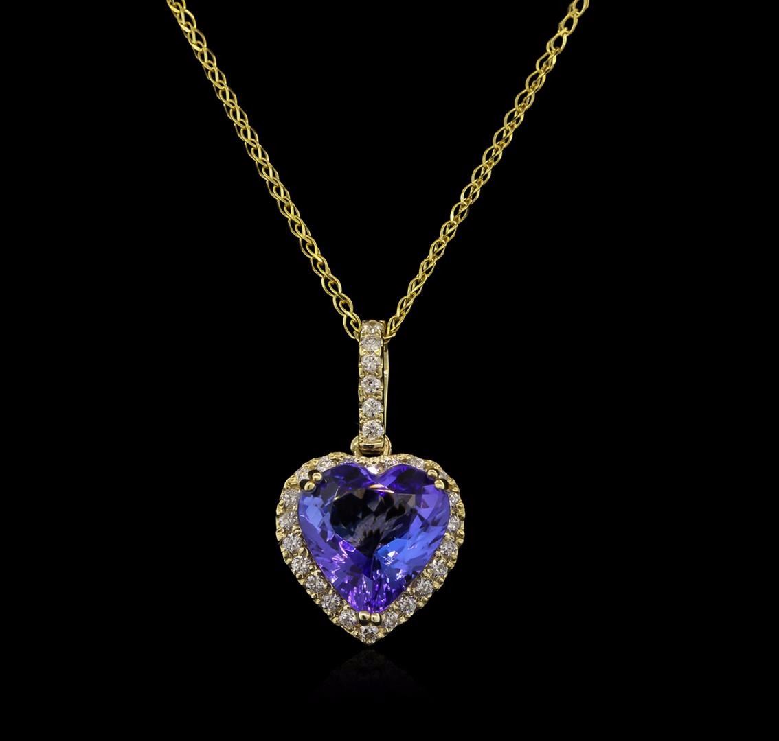 One pendant with chain featuring: 14KT yellow gold weighing 1.95 grams containing one tanzanite center stone with a total weight of 3.11ct and 28 diamonds with a total weight of 0.25ct.