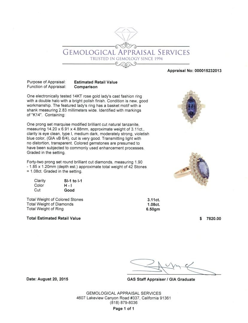 One electronically tested 14KT rose gold lady's cast fashion ring with a double halo with a bright polish finish. The featured lady's ring has a basket motif with a shank measuring 2.83 millimeters wide. Identified with markings of "K14". Condition is new, good workmanship. Containing: One prong set marquise modified brilliant cut natural tanzanite, measuring 14.20 x 6.91 x 4.88mm, approximate weight of 3.11ct., clarity is eye clean, type I, medium dark, moderately strong, violetish blue color, (GIA vB 6/4), cut is very good. Transmitting light with no distortion, transparent. Colored gemstones are presumed to have been subjected to commonly used enhancement processes. Graded in the setting. Forty-Two prong set round brilliant cut diamonds, measuring 1.90 - 1.85 x 1.20mm (depth est.) approximate total weight of 42 Stones = 1.08ct. Graded in the setting. Clarity: SI-1 to I-1. Color: H - I. Cut Good. Total Weight of Colored Stones 3.11ct. Total Weight of Diamonds 1.08ct. Total Weight of Ring 6.50gm. GAS Appraised at $7,820.00.