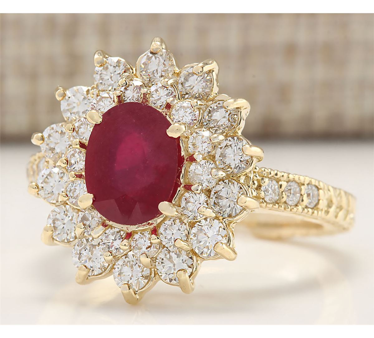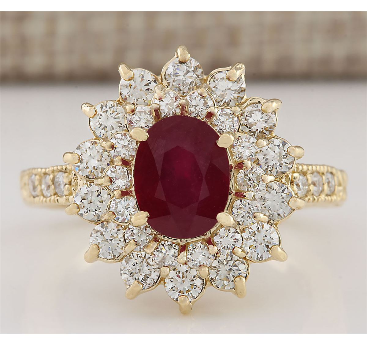 Stamped: 14K Ring Size: 6.5 Total Ring Weight: 5.5 Grams Diamond Weight: Total natural diamond weight is 1.30carat. SI1-SI2 clarity / G-H color Gemstone Weight: Total Natural Ruby Weight is 1.80ctw (Measures: 7.80x6.15mm) Heated only !! Main Stone Color: Red Face Measures: 17.20x15.40mm SKU: [703733]