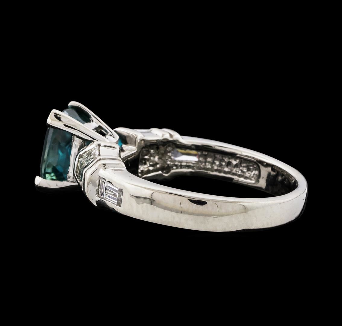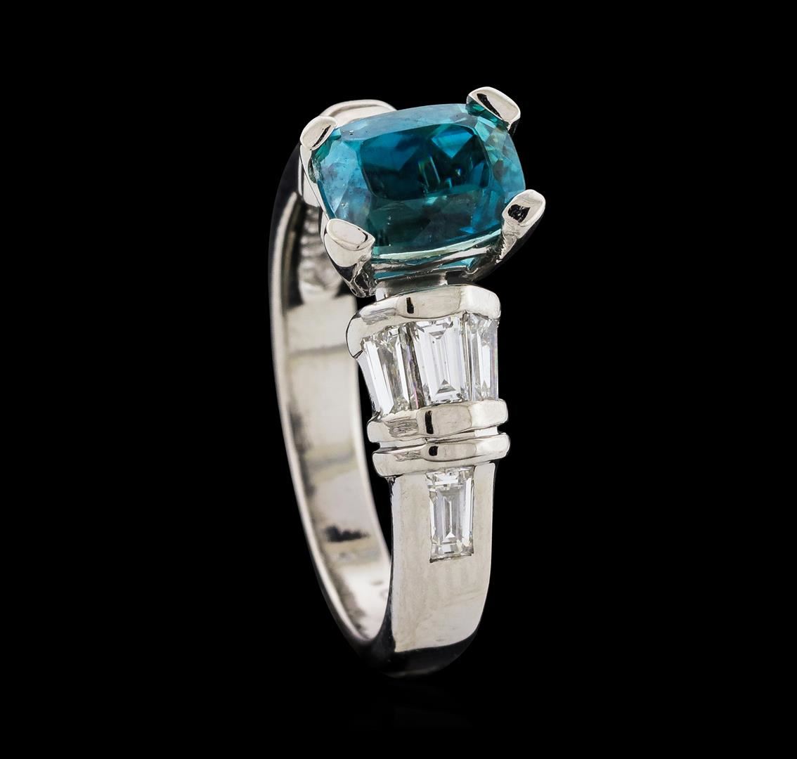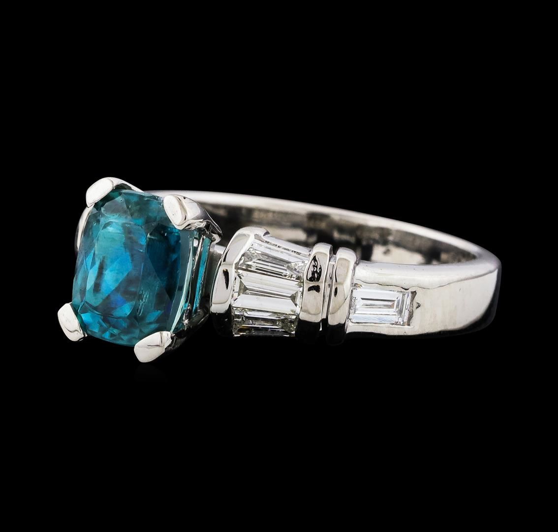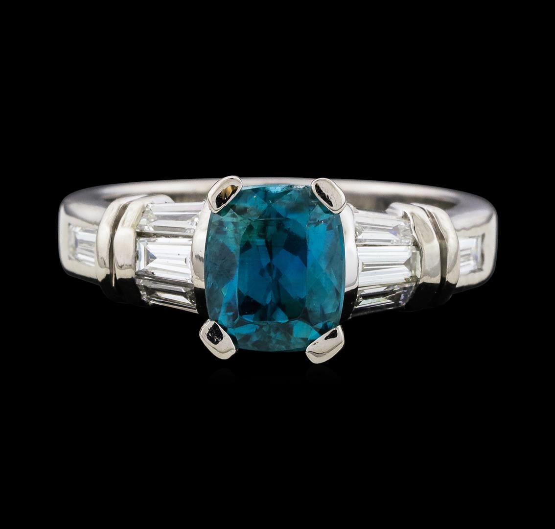 One Blue Zircon and Diamond Ring featuring: Platinum with a total weight of 8.21 grams, Blue Zircon with a total weight of 3.12ct, and side diamonds with a total weight of 0.60ctw,