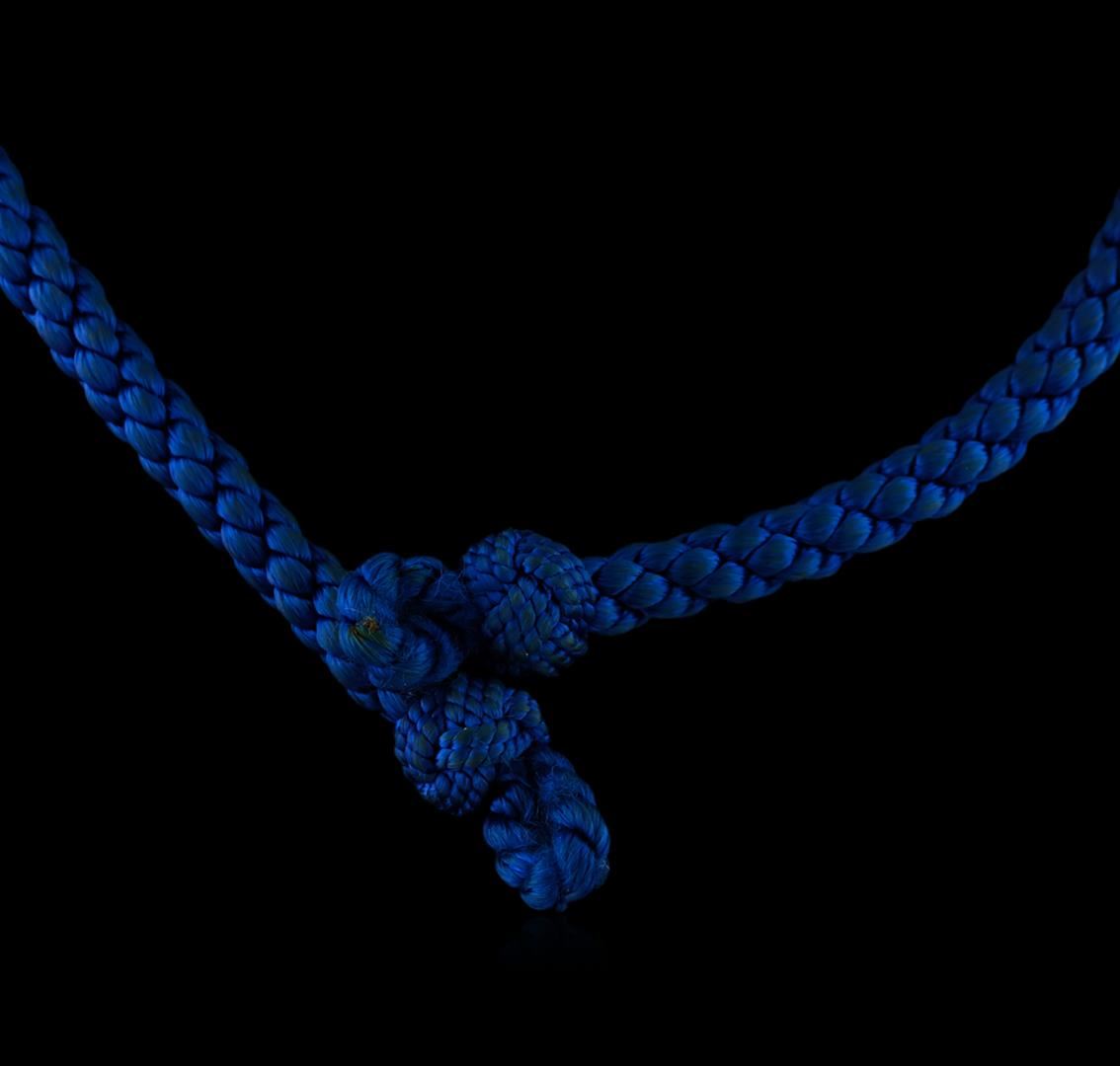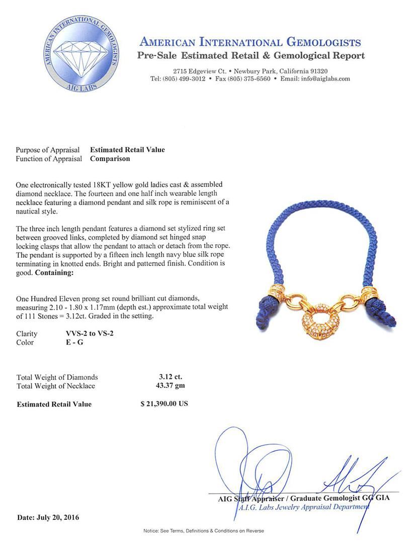 One electronically tested 18KT yellow gold ladies cast & assembled diamond necklace. The fourteen and one half inch wearable length necklace featuring a diamond pendant and silk rope is reminiscent of a nautical style. The three inch length pendant features a diamond set 'Lifesaver' set between grooved links completed by diamond set hinged snap locking clasps that allow the pendant to attach or detach from the rope. The pendant is supported by a fifteen inch length navy blue silk rope terminating in knotted ends. Bright and patterned finish. Condition is good. Containing: One Hundred Eleven prong set round brilliant cut diamonds, measuring 2.10 - 1.80 x 1.17mm (depth est.) approximate total weight of 111 Stones = 3.12ct. Graded in the setting. Clarity VVS-2 to VS-2. Color: E - G. Total Weight of Diamonds 3.12ct.. Total Weight of Necklace 43.37gm. AIG Appraised at $21,390.00.