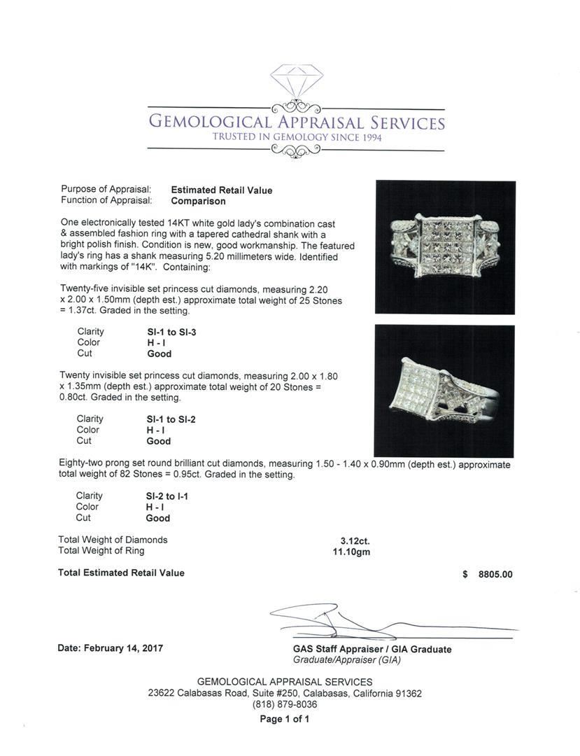 One electronically tested 14KT white gold lady's combination cast & assembled fashion ring with a tapered cathedral shank with a bright polish finish. The featured lady's ring has a shank measuring 5.20 millimeters wide. Identified with markings of '14K'. Condition is new, good workmanship. Containing: Twenty-Five invisible set princess cut diamonds, measuring 2.20 x 2.00 x 1.50mm (depth est.) approximate total weight of 25 Stones = 1.37ct. Graded in the setting. Clarity SI-1 to SI-3. Color: H - I Cut Good Twenty invisible set princess cut diamonds, measuring 2.00 x 1.80 x 1.35mm (depth est.) approximate total weight of 20 Stones = 0.80 ct. Graded in the setting. Clarity SI-1 to SI-2. Color: H - I Cut Good Eighty-Two prong set round brilliant cut diamonds, measuring 1.50 - 1.40 x 0.90mm (depth est.) approximate total weight of 82 Stones = 0.95ct. Graded in the setting. Clarity SI-2 to I-1. Color: H - I Cut Good. Total Weight of Diamonds 3.12ct.. Total Weight of Ring 11.10gm. GAS Appraised.
