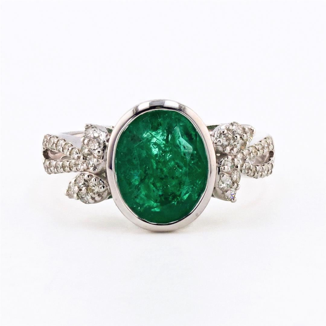 Eighteen karat (18K) white gold natural emerald beryl and diamond ring. An oval brilliant cut natural emerald beryl gemstone is mounted in the center of the ring. Round brilliant cut diamonds accent the ring around and on both sides of the center gemstone