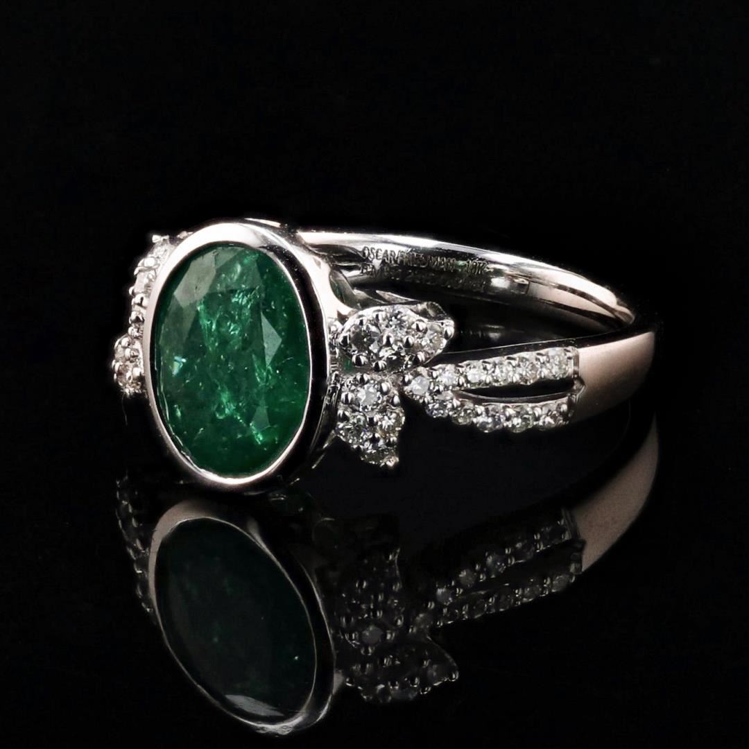 Eighteen karat (18K) white gold natural emerald beryl and diamond ring. An oval brilliant cut natural emerald beryl gemstone is mounted in the center of the ring. Round brilliant cut diamonds accent the ring around and on both sides of the center gemstone. The ring has a gross weight of 4.9 Grams. #NATURAL GEMSTONE# GEMSTONE: Emerald Beryl NATURE: Natural SHAPE: Oval Brilliant, Faceted Cut WEIGHT: 3.12 carat total DIMENSIONS: 9.76 x 8.14mm CLARITY: Type 3 COLOR: Green (5/5) SYMMETRY: Excellent COLOR INTENSITY: Intense TRANSPARENCY: Transparent TONE: Dark #NATURAL DIAMOND# SHAPE: Round Brilliant Cut WEIGHT: 0.38 carat total (38pcs.) DIMENSIONS: 1.3 x 1.1mm AVERAGE CLARITY: SI1-SI2 AVERAGE COLOR: G-H SYMMETRY: Excellent POLISH: Excellent #METAL# METAL: Gold PURITY: 18K (750) COLOR: White CONDITION: Excellent FINISH: High Polish Size: 6 1/2