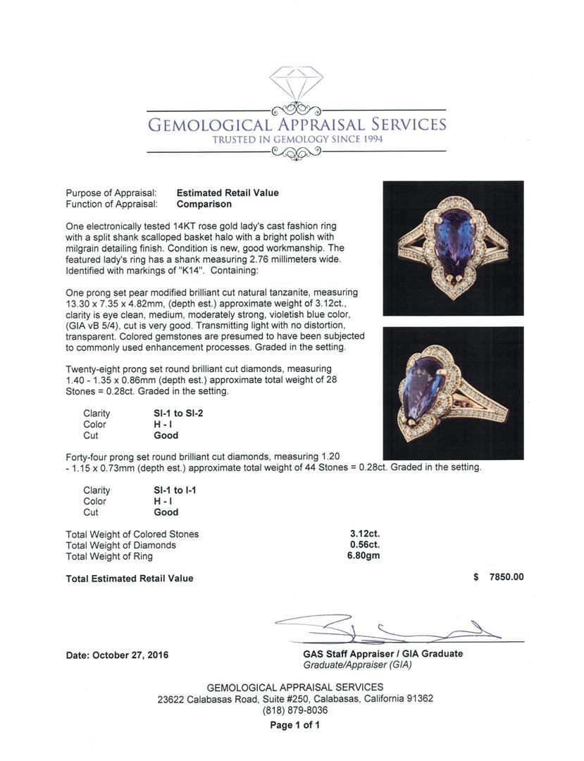 One electronically tested 14KT rose gold lady's cast fashion ring with a split shank scalloped basket halo with a bright polish with milgrain detailing finish. The featured lady's ring has a shank measuring 2.76 millimeters wide. Identified with markings of 'K14'. Condition is new, good workmanship. Containing: One prong set pear modified brilliant cut natural tanzanite, measuring 13.30 x 7.35 x 4.82mm, (depth est.) approximate weight of 3.12ct., clarity is eye clean, medium, moderately strong, violetish blue color, (GIA vB 5/4), cut is very good. Transmitting light with no distortion, transparent. Colored gemstones are presumed to have been subjected to commonly used enhancement processes. Graded in the setting. Twenty-Eight prong set round brilliant cut diamonds, measuring 1.40 - 1.35 x 0.86mm (depth est.) approximate total weight of 28 Stones = 0.28ct. Graded in the setting. Clarity SI-1 to SI-2. Color: H - I Cut Good Forty-Four prong set round brilliant cut diamonds, measuring 1.20 - 1.15 x 0.73mm (depth est.) approximate total weight of 44 Stones = 0.28ct. Graded in the setting. Clarity SI-1 to I-1. Color: H - I Cut Good. Total Weight of Colored Stones 3.12ct.. Total Weight of Diamonds 0.56ct.. Total Weight of Ring 6.80gm. GAS Appraised at $7,850.00.