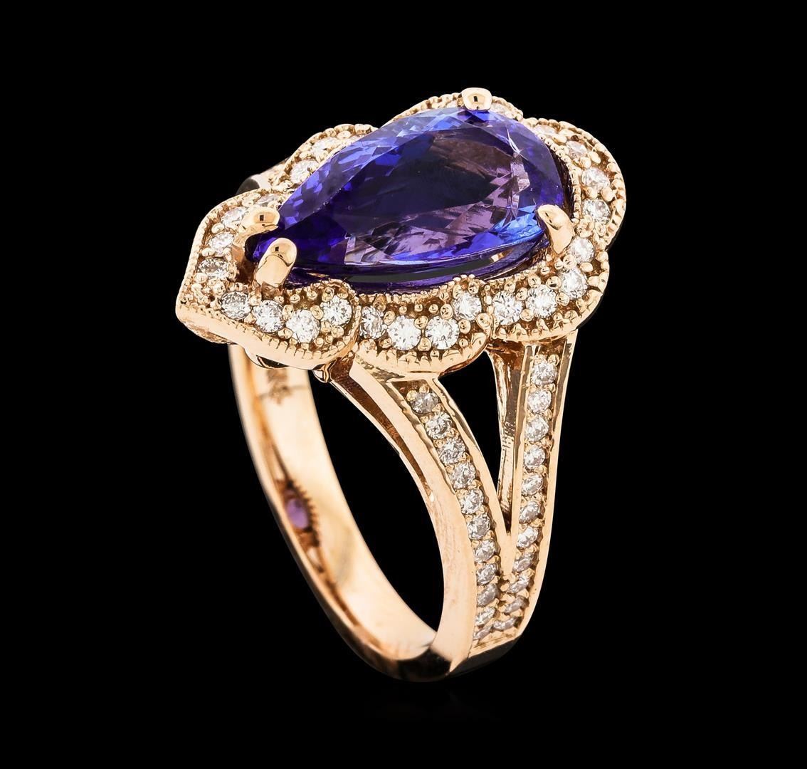 One electronically tested 14KT rose gold lady's cast fashion ring with a split shank scalloped basket halo with a bright polish with milgrain detailing finish. The featured lady's ring has a shank measuring 2.76 millimeters wide. Identified with markings of 'K14'. Condition is new, good workmanship. Containing: One prong set pear modified brilliant cut natural tanzanite, measuring 13.30 x 7.35 x 4.82mm, (depth est.) approximate weight of 3.12ct., clarity is eye clean, medium, moderately strong, violetish blue color, (GIA vB 5/4), cut is very good. Transmitting light with no distortion, transparent. Colored gemstones are presumed to have been subjected to commonly used enhancement processes. Graded in the setting. Twenty-Eight prong set round brilliant cut diamonds, measuring 1.40 - 1.35 x 0.86mm (depth est.) approximate total weight of 28 Stones = 0.28ct. Graded in the setting. Clarity SI-1 to SI-2. Color: H - I Cut Good Forty-Four prong set round brilliant cut diamonds, measuring 1.20 - 1.15 x 0.73mm (depth est.) approximate total weight of 44 Stones = 0.28ct. Graded in the setting. Clarity SI-1 to I-1. Color: H - I Cut Good. Total Weight of Colored Stones 3.12ct.. Total Weight of Diamonds 0.56ct.. Total Weight of Ring 6.80gm.