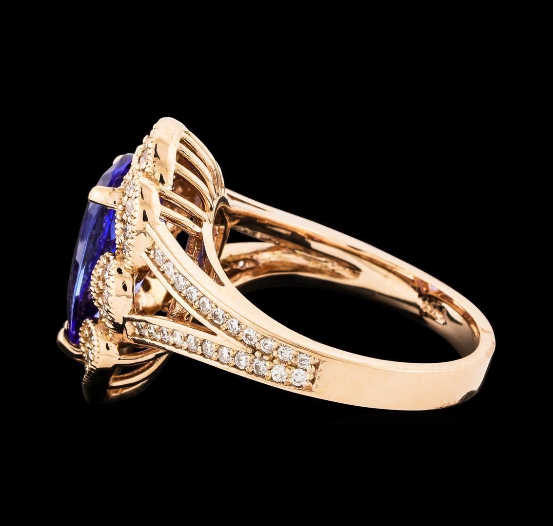 One electronically tested 14KT rose gold lady's cast fashion ring with a split shank scalloped basket halo with a bright polish with milgrain detailing finish. The featured lady's ring has a shank measuring 2.76 millimeters wide. Identified with markings of 'K14'. Condition is new, good workmanship. Containing: One prong set pear modified brilliant cut natural tanzanite, measuring 13.30 x 7.35 x 4.82mm, (depth est.) approximate weight of 3.12ct., clarity is eye clean, medium, moderately strong, violetish blue color, (GIA vB 5/4), cut is very good. Transmitting light with no distortion, transparent. Colored gemstones are presumed to have been subjected to commonly used enhancement processes. Graded in the setting. Twenty-Eight prong set round brilliant cut diamonds, measuring 1.40 - 1.35 x 0.86mm (depth est.) approximate total weight of 28 Stones = 0.28ct. Graded in the setting. Clarity SI-1 to SI-2. Color: H - I Cut Good Forty-Four prong set round brilliant cut diamonds, measuring 1.20 - 1.15 x 0.73mm (depth est.) approximate total weight of 44 Stones = 0.28ct. Graded in the setting. Clarity SI-1 to I-1. Color: H - I Cut Good. Total Weight of Colored Stones 3.12ct.. Total Weight of Diamonds 0.56ct.. Total Weight of Ring 6.80gm.