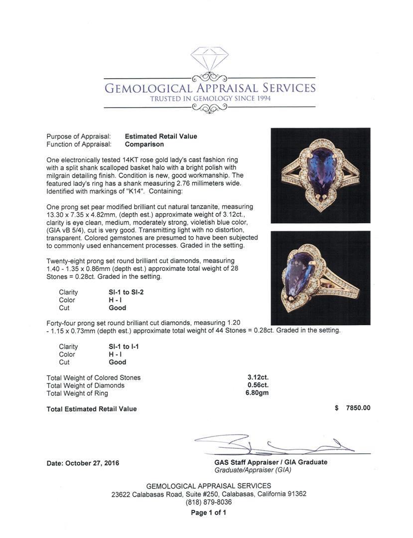 One electronically tested 14KT rose gold lady's cast fashion ring with a split shank scalloped basket halo with a bright polish with milgrain detailing finish. The featured lady's ring has a shank measuring 2.76 millimeters wide. Identified with markings of 'K14'. Condition is new, good workmanship. Containing: One prong set pear modified brilliant cut natural tanzanite, measuring 13.30 x 7.35 x 4.82mm, (depth est.) approximate weight of 3.12ct., clarity is eye clean, medium, moderately strong, violetish blue color, (GIA vB 5/4), cut is very good. Transmitting light with no distortion, transparent. Colored gemstones are presumed to have been subjected to commonly used enhancement processes. Graded in the setting. Twenty-Eight prong set round brilliant cut diamonds, measuring 1.40 - 1.35 x 0.86mm (depth est.) approximate total weight of 28 Stones = 0.28ct. Graded in the setting. Clarity SI-1 to SI-2. Color: H - I Cut Good Forty-Four prong set round brilliant cut diamonds, measuring 1.20 - 1.15 x 0.73mm (depth est.) approximate total weight of 44 Stones = 0.28ct. Graded in the setting. Clarity SI-1 to I-1. Color: H - I Cut Good. Total Weight of Colored Stones 3.12ct.. Total Weight of Diamonds 0.56ct.. Total Weight of Ring 6.80gm.