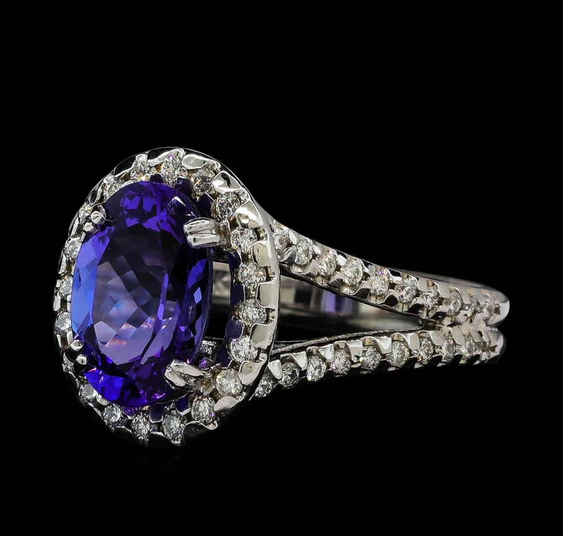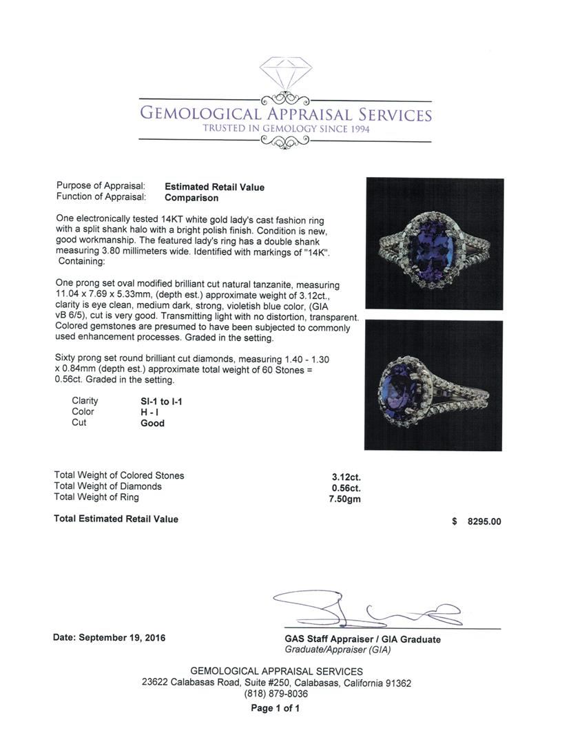 One electronically tested 14KT white gold lady's cast fashion ring with a split shank halo with a bright polish finish. The featured lady's ring has a double shank measuring 3.80 millimeters wide. Identified with markings of '14K'. Condition is new, good workmanship. Containing: One prong set oval modified brilliant cut natural tanzanite, measuring 11.04 x 7.69 x 5.33mm, (depth est.) approximate weight of 3.12ct., clarity is eye clean, medium dark, strong, violetish blue color, (GIA vB 6/5), cut is very good. Transmitting light with no distortion, transparent. Colored gemstones are presumed to have been subjected to commonly used enhancement processes. Graded in the setting. Sixty prong set round brilliant cut diamonds, measuring 1.40 - 1.30 x 0.84mm (depth est.) approximate total weight of 60 Stones = 0.56ct. Graded in the setting. Clarity SI-1 to I-1. Color: H - I Cut Good. Total Weight of Colored Stones 3.12ct.. Total Weight of Diamonds 0.56ct.. Total Weight of Ring 7.50gm. GAS Appraised at $8,295.00.