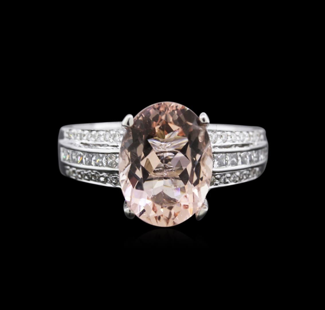 One electronically tested 18KT white gold ladies cast morganite and diamond ring with a bright polish finish. Identified with markings of "K18". Condition is new. Containing: One prong set oval modified brilliant cut natural morganite, measuring 11.44 x 8.58 x 5.58mm, approximate weight of 3.13ct., clarity is eye clean, type I, very light, slightly brownish, reddish orange color, (GIA rO 2/2), cut is good. Fifty-Four prong set round brilliant cut diamonds, measuring 1.30 - 1.10 x 0.72mm (depth est.) approximate total weight of 54 Stones = 0.34ct. Clarity: SI-1 to SI-2. Color: I - J, Cut is Good. Sixteen channel set princess cut diamonds, measuring 1.50 x 1.50 x 1.13mm (depth est.) approximate total weight of 16 Stones = 0.33ct. Clarity: SI-1. Color: H - I, Cut is Good. Colored gemstones are presumed to have been subjected to commonly used enhancement processes. All diamonds and colored gemstones are graded in the mounting, unless otherwise stated. Total Weight of Colored Stones 3.13ct. Total Weight of Diamonds 0.67ct. Total Weight of Ring 5.60 grams. GGL Appraised at $3,125.00.
