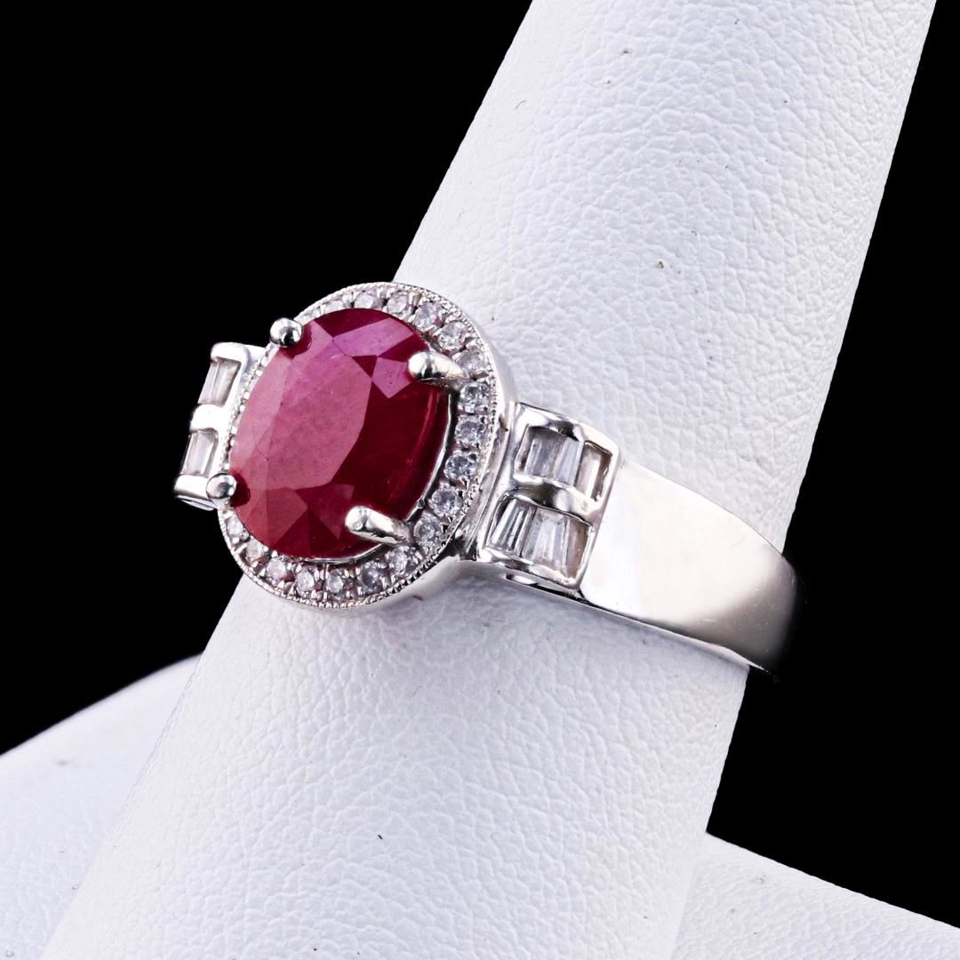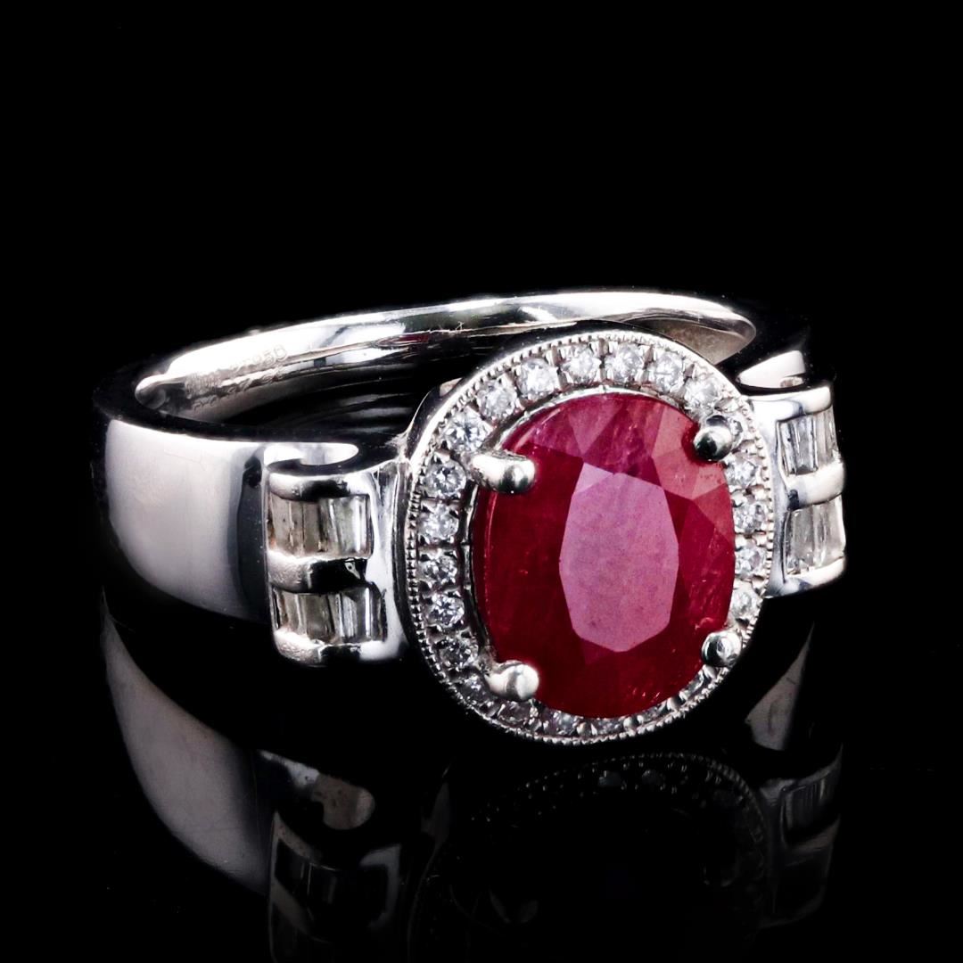 One polished, stamped, and tested platinum ring with a bright finish. The ring is mounted with: 1 genuine ruby center stone weighing approximately 3.13 carat, and 36 genuine faceted diamonds weighing approximately 0.37 carats. This item weighs 9.9 grams, condition is new, excellent workmanship. #MAIN GEMSTONE# Species: Natural Corundum; Variety: Ruby; Shape: Oval; Cutting Style: Brilliant Cut Crown, Step Cut Pavilion; Measurements: 9.6 x 7.7 x 4.5mm; Weight: 3.13 carat; Color: Red; Cut Grade: Very Good; Refractive Index: 1.762 - 1.770 DR; Hardness: 9 #ADJACENT GEMSTONES ON RING# Identity: Natural Diamond; Shape and Cutting Style: Baguette / Round Brilliant; Quantity: 36 Diamonds; Measurements: 1.8mm (12 baguette), 1.1mm (24 round); Total Weight: 0.37 carats; CLARITY GRADE: VS1 - VS2; Color Grade: F - G; Refractive Index: 2.418; Hardness: 10; RUBY WEIGHT: 3.13 ct; TOTAL DIAMOND WEIGHT: 0.37 cts; WEIGHT OF ITEM: 9.9 grams; METAL: Platinum #Size: 8 1/4