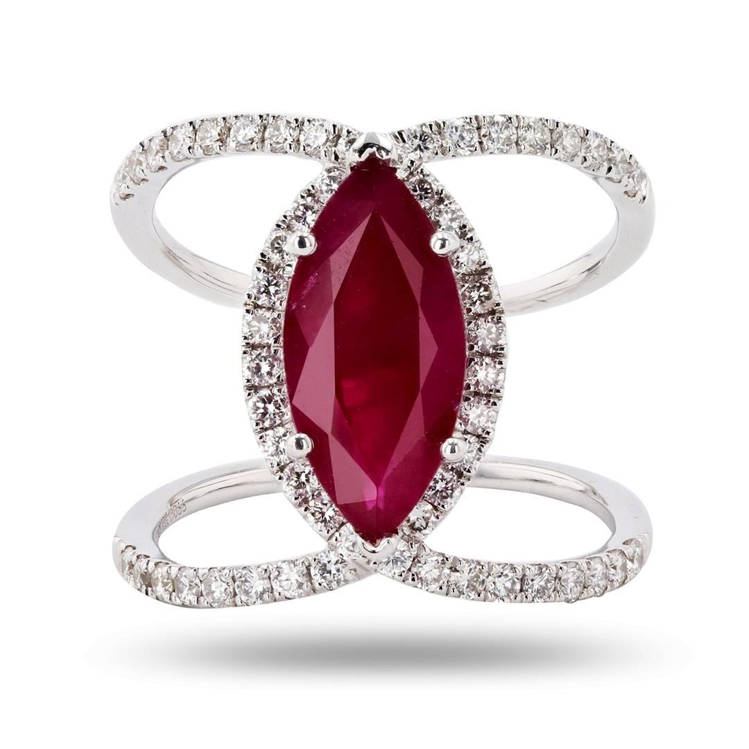 3.13ct Ruby and 0.66ctw Diamond 18K White Gold Ring. One electronically tested 18KT white gold ladies cast & assembled ruby & diamond ring. Condition is new, good workmanship. The featured ruby is set within a diamond bezel, supported by diamond set open shoulders that are connected by a bar on the back of the band. Measuring seven millimeters wide at the back of the band. Bright polish finish. Identified with markings of "18K". Containing: One prong set marquise mixed cut natural ruby, measuring 15.30 x 6.60 x 4.00mm, approximate weight of 3.13ct., clarity is heavily included, type II, medium dark, very slightly brownish, slightly purplish red color, (GIA slpR 6/3), cut is good. Transmitting light somewhat diffusely, transparent to translucent. Naturally occurring internal & external characteristics are present. Indications of laboratory high temperature heat treatment, with glass & flux additives. Graded in the setting. Ruby has a low tolerance to rhodium plating, repolishing the surface, & ultrasonic cleaning. Fifty-six prong set round brilliant cut diamonds approximate total weight of 56 Stones = 0.66ctw. The clarity & color grade reflect the overall average for the group. Graded in the setting. Clarity SI1 to I1 Color G - I Total Weight of Colored Stones 3.13ct. Total Weight of Diamonds 0.66ctw. Total Weight of Ring 4.90 gm