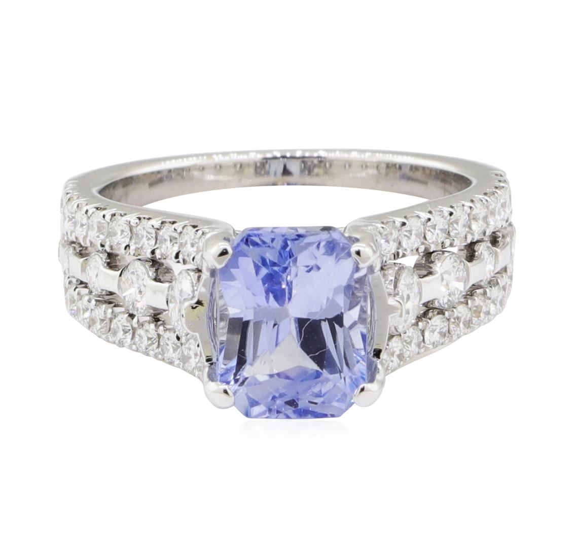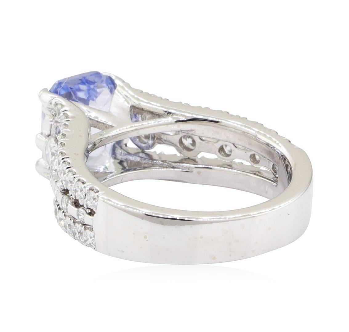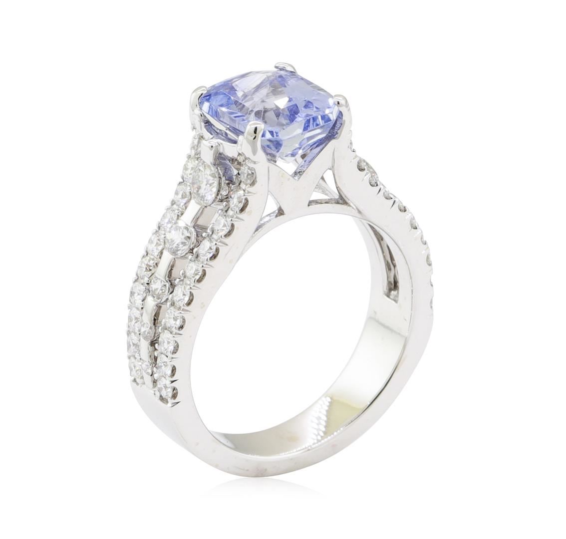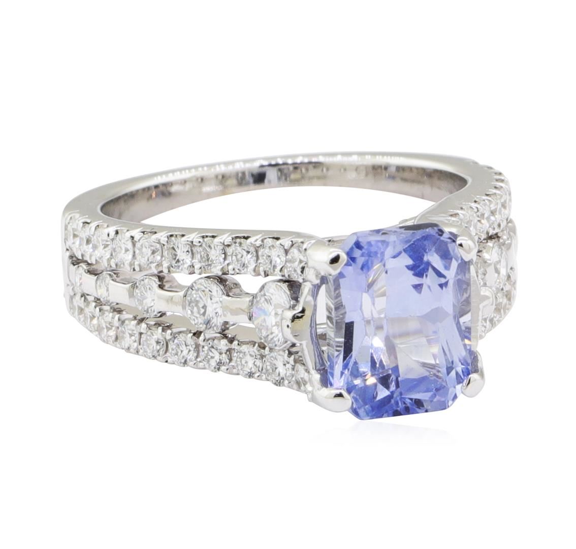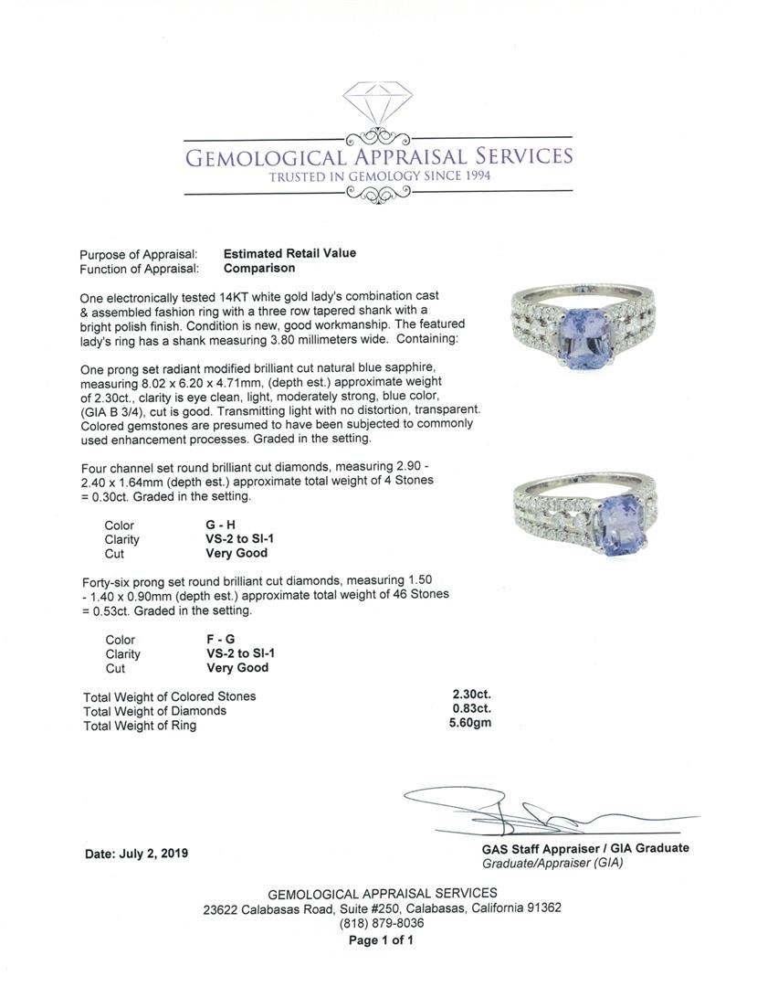 One electronically tested 14KT white gold lady's combination cast & assembled fashion ring with a three row tapered shank with a bright polish finish. The featured lady's ring has a shank measuring 3.80 millimeters wide. Condition is new, good workmanship. Containing: One prong set radiant modified brilliant cut natural blue sapphire, measuring 8.02 x 6.20 x 4.71mm, (depth est.) approximate weight of 2.30ct., clarity is eye clean, light, moderately strong, blue color, (GIA B 3/4), cut is good. Transmitting light with no distortion, transparent. Colored gemstones are presumed to have been subjected to commonly used enhancement processes. Graded in the setting. Four channel set round brilliant cut diamonds, measuring 2.90 - 2.40 x 1.64mm (depth est.) approximate total weight of 4 Stones = 0.30ct. Graded in the setting. Color G - H Clarity VS-2 to SI-1 Cut Very Good Forty-Six prong set round brilliant cut diamonds, measuring 1.50 - 1.40 x 0.90mm (depth est.) approximate total weight of 46 Stones = 0.53ct. Graded in the setting. Color F - G Clarity VS-2 to SI-1 Cut Very Good. Total Weight of Colored Stones 2.30ct.. Total Weight of Diamonds 0.83ct.. Total Weight of Ring 5.60gm GAS Appraised at $5365.00. GAS Appraised at $5,365.00.