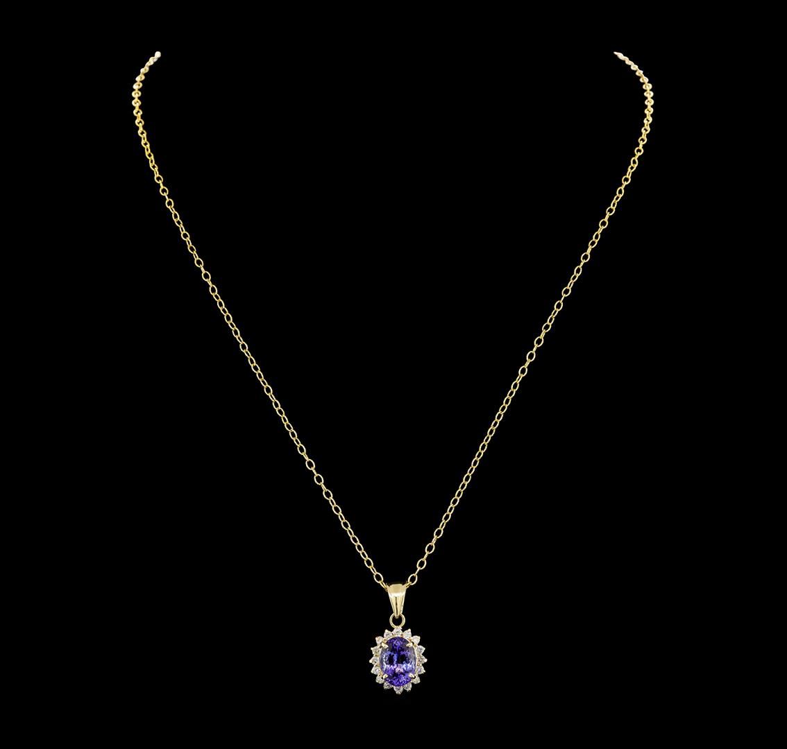 One electronically tested 14KT yellow gold lady's combination cast & assembled fashion pendant & chain 18.0' long, 1.9mm twisted oval shape link with a lobster claw clasp with a bright polish finish. Identified with markings of '14K'. Condition is new, good workmanship. Containing: One prong set oval modified brilliant cut natural tanzanite, measuring 10.51 x 7.64 x 5.47mm, (depth est.) approximate weight of 3.13ct., clarity is eye clean, medium, moderately strong, bluish violet color, (GIA bV 5/4), cut is very good. Transmitting light with no distortion, transparent. Colored gemstones are presumed to have been subjected to commonly used enhancement processes. Graded in the setting. Sixteen prong set round brilliant cut diamonds, measuring 1.90 - 1.80 x 1.15mm (depth est.) approximate total weight of 16 Stones = 0.40ct. Graded in the setting. Clarity SI-1 to SI-2. Color: H - I Cut Good. Total Weight of Colored Stones 3.13ct.. Total Weight of Diamonds 0.40ct.. Total Weight of Pendant & Chain 5.20gm. GAS Appraised at $6,610.00.