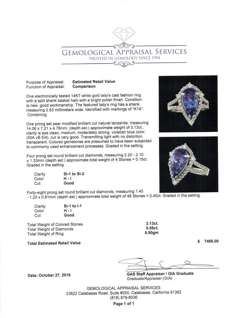 One electronically tested 14KT white gold lady's cast fashion ring with a split shank basket halo with a bright polish finish. The featured lady's ring has a shank measuring 2.83 millimeters wide. Identified with markings of 'K14'. Condition is new, good workmanship. Containing: One prong set pear modified brilliant cut natural tanzanite, measuring 14.06 x 7.21 x 4.76mm, (depth est.) approximate weight of 3.13ct., clarity is eye clean, medium, moderately strong, violetish blue color, (GIA vB 5/4), cut is very good. Transmitting light with no distortion, transparent. Colored gemstones are presumed to have been subjected to commonly used enhancement processes. Graded in the setting. Four prong set round brilliant cut diamonds, measuring 2.20 - 2.10 x 1.33mm (depth est.) approximate total weight of 4 Stones = 0.15ct. Graded in the setting. Clarity SI-1 to SI-2. Color: H - I Cut Good Forty-Eight prong set round brilliant cut diamonds, measuring 1.40 - 1.20 x 0.81mm (depth est.) approximate total weight of 48 Stones = 0.40ct. Graded in the setting. Clarity SI-1 to I-1. Color: H - I Cut Good. Total Weight of Colored Stones 3.13ct.. Total Weight of Diamonds 0.55ct.. Total Weight of Ring 5.90gm. GAS Appraised at $7,485.00.
