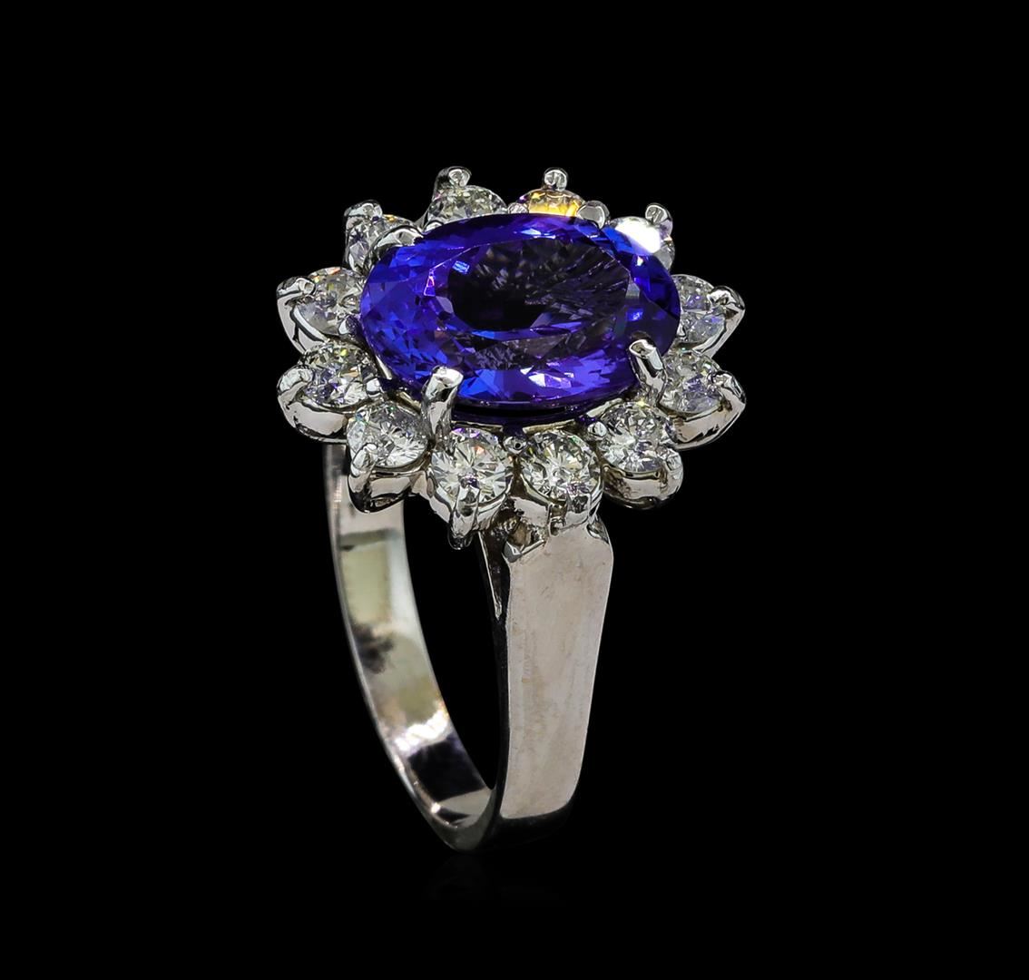 One electronically tested 14KT white gold lady's cast fashion ring with a basket halo with a bright polish finish. The featured lady's ring has a shank measuring 2.56 millimeters wide. Identified with markings of '14K'. Condition is new, good workmanship. Containing: One prong set oval modified brilliant cut natural tanzanite, measuring 10.74 x 7.61 x 5.45mm, (depth est.) approximate weight of 3.13ct., clarity is eye clean, medium dark, moderately strong, violetish blue color, (GIA vB 6/4), cut is very good. Transmitting light with no distortion, transparent. Colored gemstones are presumed to have been subjected to commonly used enhancement processes. Graded in the setting. Twelve prong set round brilliant cut diamonds, measuring 2.80 - 2.75 x 1.72mm (depth est.) approximate total weight of 12 Stones = 0.96ct. Graded in the setting. Clarity SI-1 to I-1. Color: H - I Cut Good. Total Weight of Colored Stones 3.13ct.. Total Weight of Diamonds 0.96ct.. Total Weight of Ring 5.30gm GAS Appraised at $8,190.00.