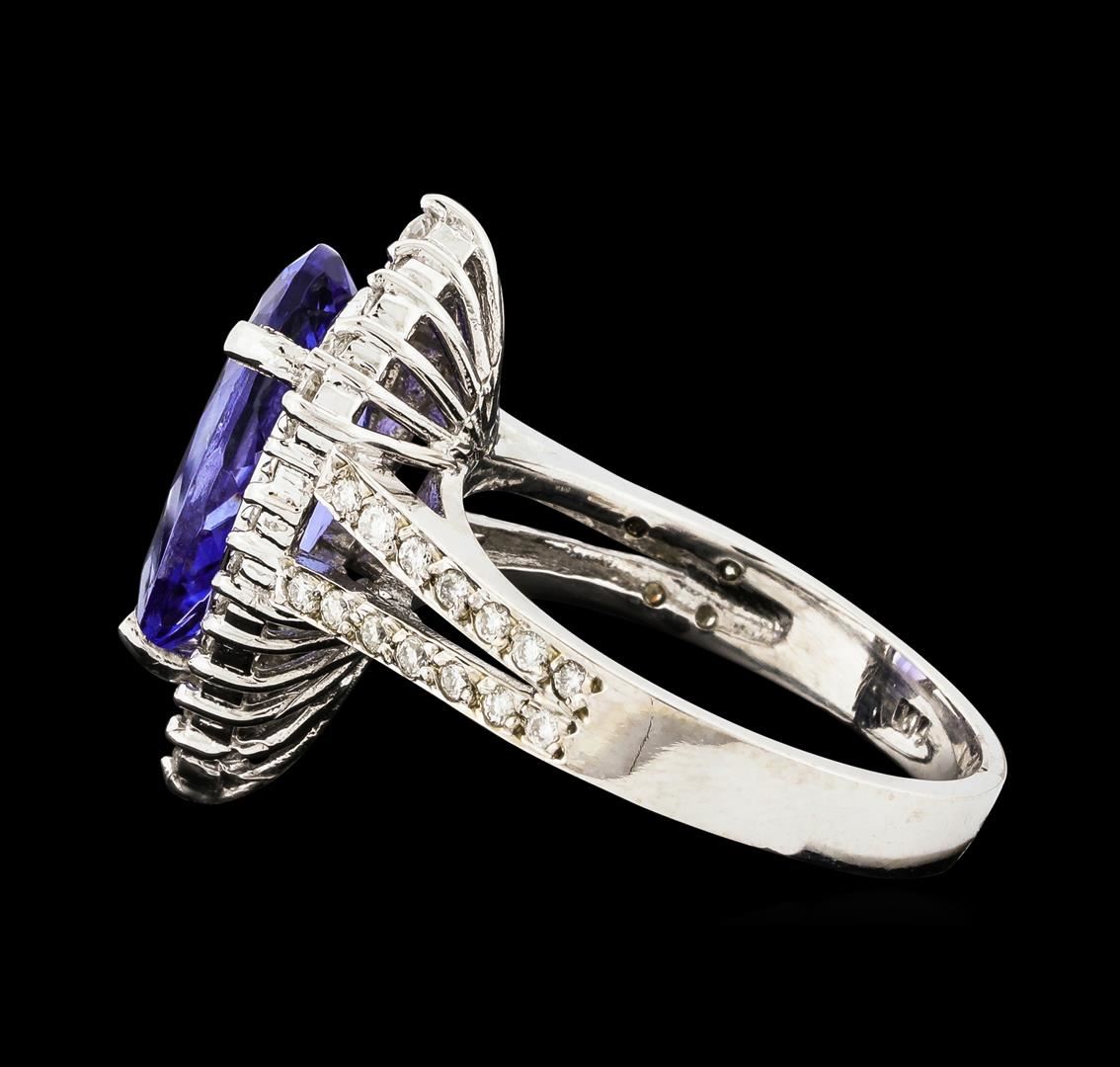 One electronically tested 14KT white gold lady's cast fashion ring with a split shank basket halo with a bright polish finish. The featured lady's ring has a shank measuring 2.83 millimeters wide. Identified with markings of 'K14'. Condition is new, good workmanship. Containing: One prong set pear modified brilliant cut natural tanzanite, measuring 14.06 x 7.21 x 4.76mm, (depth est.) approximate weight of 3.13ct., clarity is eye clean, medium, moderately strong, violetish blue color, (GIA vB 5/4), cut is very good. Transmitting light with no distortion, transparent. Colored gemstones are presumed to have been subjected to commonly used enhancement processes. Graded in the setting. Four prong set round brilliant cut diamonds, measuring 2.20 - 2.10 x 1.33mm (depth est.) approximate total weight of 4 Stones = 0.15ct. Graded in the setting. Clarity SI-1 to SI-2. Color: H - I Cut Good Forty-Eight prong set round brilliant cut diamonds, measuring 1.40 - 1.20 x 0.81mm (depth est.) approximate total weight of 48 Stones = 0.40ct. Graded in the setting. Clarity SI-1 to I-1. Color: H - I Cut Good. Total Weight of Colored Stones 3.13ct.. Total Weight of Diamonds 0.55ct.. Total Weight of Ring 5.90gm. GAS Appraised at $7,485.00.