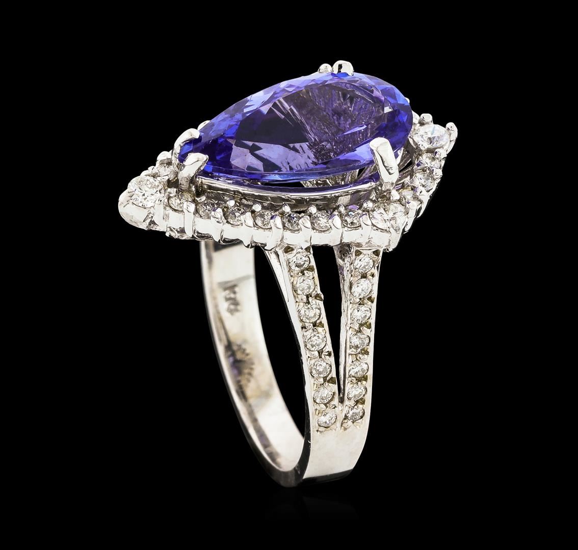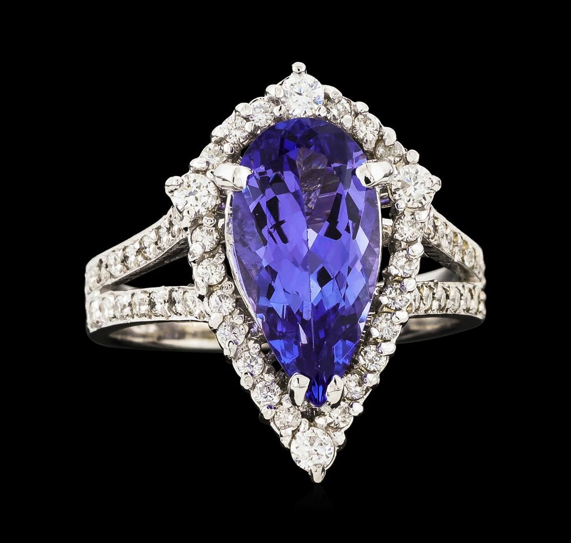 One electronically tested 14KT white gold lady's cast fashion ring with a split shank basket halo with a bright polish finish. The featured lady's ring has a shank measuring 2.83 millimeters wide. Identified with markings of 'K14'. Condition is new, good workmanship. Containing: One prong set pear modified brilliant cut natural tanzanite, measuring 14.06 x 7.21 x 4.76mm, (depth est.) approximate weight of 3.13ct., clarity is eye clean, medium, moderately strong, violetish blue color, (GIA vB 5/4), cut is very good. Transmitting light with no distortion, transparent. Colored gemstones are presumed to have been subjected to commonly used enhancement processes. Graded in the setting. Four prong set round brilliant cut diamonds, measuring 2.20 - 2.10 x 1.33mm (depth est.) approximate total weight of 4 Stones = 0.15ct. Graded in the setting. Clarity SI-1 to SI-2. Color: H - I Cut Good Forty-Eight prong set round brilliant cut diamonds, measuring 1.40 - 1.20 x 0.81mm (depth est.) approximate total weight of 48 Stones = 0.40ct. Graded in the setting. Clarity SI-1 to I-1. Color: H - I Cut Good. Total Weight of Colored Stones 3.13ct.. Total Weight of Diamonds 0.55ct.. Total Weight of Ring 5.90gm. GAS Appraised at $7,485.00.