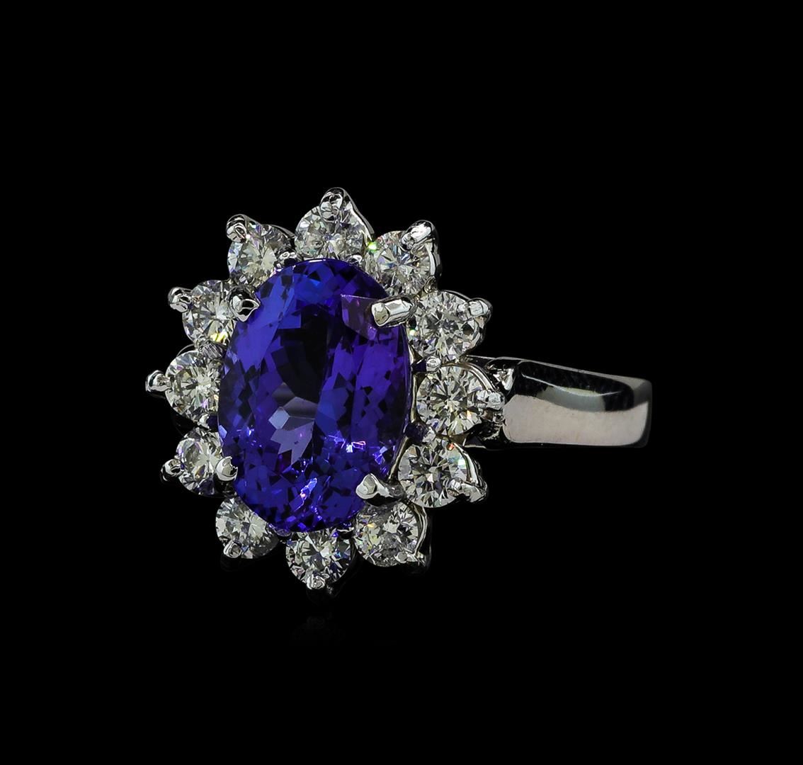 One electronically tested 14KT white gold lady's cast fashion ring with a basket halo with a bright polish finish. The featured lady's ring has a shank measuring 2.56 millimeters wide. Identified with markings of '14K'. Condition is new, good workmanship. Containing: One prong set oval modified brilliant cut natural tanzanite, measuring 10.74 x 7.61 x 5.45mm, (depth est.) approximate weight of 3.13ct., clarity is eye clean, medium dark, moderately strong, violetish blue color, (GIA vB 6/4), cut is very good. Transmitting light with no distortion, transparent. Colored gemstones are presumed to have been subjected to commonly used enhancement processes. Graded in the setting. Twelve prong set round brilliant cut diamonds, measuring 2.80 - 2.75 x 1.72mm (depth est.) approximate total weight of 12 Stones = 0.96ct. Graded in the setting. Clarity SI-1 to I-1. Color: H - I Cut Good. Total Weight of Colored Stones 3.13ct.. Total Weight of Diamonds 0.96ct.. Total Weight of Ring 5.30gm GAS Appraised at $8,190.00.