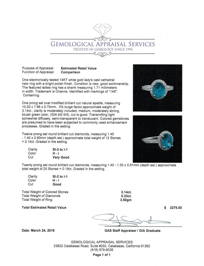 One electronically tested 14KT white gold lady's cast cathedral halo ring with a bright polish finish. The featured ladies ring has a shank measuring 1.71 millimeters in width. Trademark is Orianne. Identified with markings of "14K". Condition is new, good workmanship. Containing: One prong set oval modified brilliant cut natural apatite, measuring 10.00 x 7.96 x 5.75mm, 3%. bulge factor, approximate weight of 3.14ct., clarity is moderately included, medium, moderately strong, bluish green color, (GIA bG 5/4), cut is good. Transmitting light somewhat diffusely, semi-transparent to translucent. Colored gemstones are presumed to have been subjected to commonly used enhancement processes. Graded in the setting. Twelve prong set round brilliant cut diamonds, measuring 1.45 - 1.40 x 0.90mm (depth est.) approximate total weight of 12 Stones = 0.14ct. Graded in the setting. Clarity: SI-2 to I-1. Color: H - I. Cut Very Good Twenty prong set round brilliant cut diamonds, measuring 1.40 - 1.30 x 0.81mm (depth est.) approximate total weight of 20 Stones = 0.19ct. Graded in the setting. Clarity: SI-2 to I-1. Color: H - I. Cut Good. Total Weight of Colored Stones 3.14ct. Total Weight of Diamonds 0.33ct. Total Weight of Ring 3.50gm. GAS Appraised at $3,275.00.