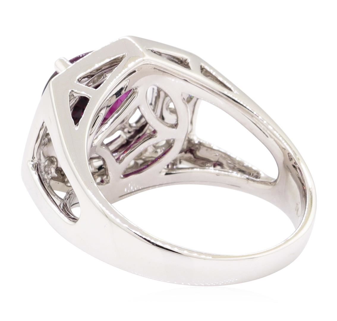One electronically tested 14KT white gold lady's cast fashion ring with a hexagonal halo with a bright polish finish. The featured lady's ring has a shank measuring 2.72 millimeters wide. Identified with markings of '14K'. Condition is new, good workmanship. Containing: One prong set oval modified mixed cut natural rhodolite garnet, measuring 8.37 x 7.40 x 4.58mm, (depth est.) 10%. bulge factor, approximate weight of 2.62ct., clarity is eye clean, dark, strong, slightly purplish red color, (GIA slpR 7/5), cut is very good. Transmitting light with no distortion, transparent. Colored gemstones are presumed to have been subjected to commonly used enhancement processes. Graded in the setting. Twelve prong set round brilliant cut diamonds, measuring 2.30 - 2.20 x 1.35mm (depth est.) approximate total weight of 12 Stones = 0.52ct. Graded in the setting. Color G - I Clarity VS-2 to SI-1 Cut Very Good. Total Weight of Colored Stones 2.62ct.. Total Weight of Diamonds 0.52ct.. Total Weight of Ring 6.40gm GAS Appraised at $3705.00. GAS Appraised.