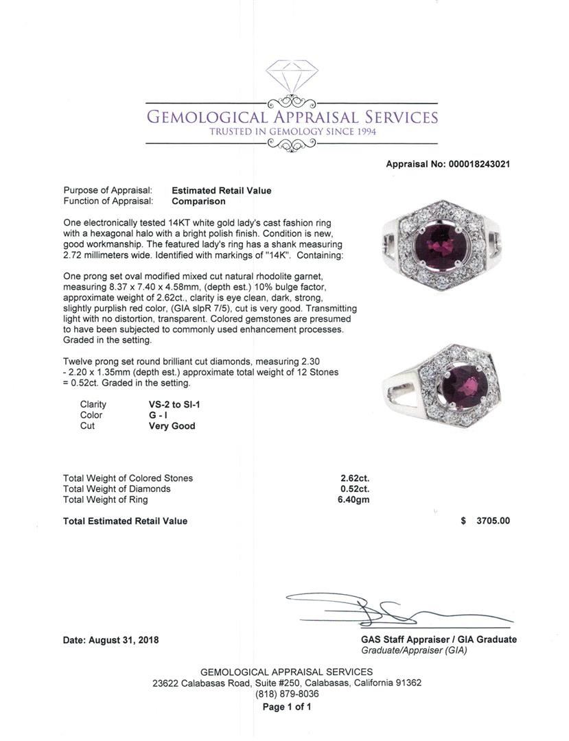One electronically tested 14KT white gold lady's cast fashion ring with a hexagonal halo with a bright polish finish. The featured lady's ring has a shank measuring 2.72 millimeters wide. Identified with markings of '14K'. Condition is new, good workmanship. Containing: One prong set oval modified mixed cut natural rhodolite garnet, measuring 8.37 x 7.40 x 4.58mm, (depth est.) 10%. bulge factor, approximate weight of 2.62ct., clarity is eye clean, dark, strong, slightly purplish red color, (GIA slpR 7/5), cut is very good. Transmitting light with no distortion, transparent. Colored gemstones are presumed to have been subjected to commonly used enhancement processes. Graded in the setting. Twelve prong set round brilliant cut diamonds, measuring 2.30 - 2.20 x 1.35mm (depth est.) approximate total weight of 12 Stones = 0.52ct. Graded in the setting. Color G - I Clarity VS-2 to SI-1 Cut Very Good. Total Weight of Colored Stones 2.62ct.. Total Weight of Diamonds 0.52ct.. Total Weight of Ring 6.40gm GAS Appraised at  $3705.00. GAS Appraised.