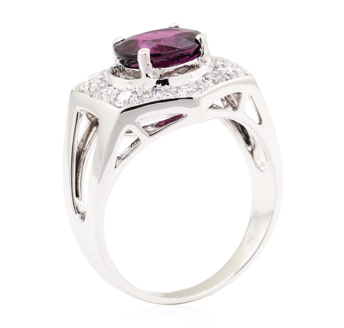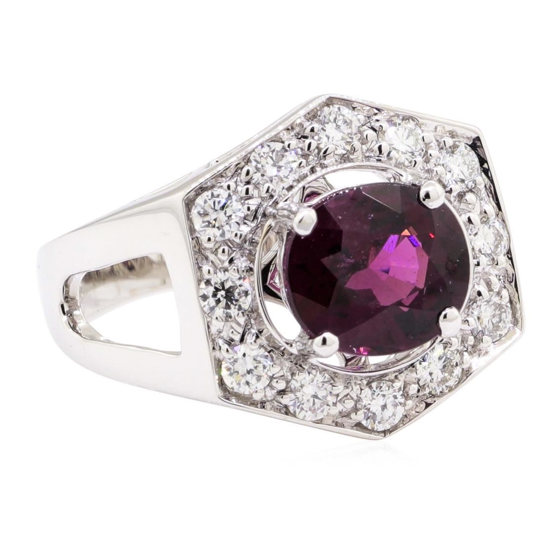 One electronically tested 14KT white gold lady's cast fashion ring with a hexagonal halo with a bright polish finish. The featured lady's ring has a shank measuring 2.72 millimeters wide. Identified with markings of '14K'. Condition is new, good workmanship. Containing: One prong set oval modified mixed cut natural rhodolite garnet, measuring 8.37 x 7.40 x 4.58mm, (depth est.) 10%. bulge factor, approximate weight of 2.62ct., clarity is eye clean, dark, strong, slightly purplish red color, (GIA slpR 7/5), cut is very good. Transmitting light with no distortion, transparent. Colored gemstones are presumed to have been subjected to commonly used enhancement processes. Graded in the setting. Twelve prong set round brilliant cut diamonds, measuring 2.30 - 2.20 x 1.35mm (depth est.) approximate total weight of 12 Stones = 0.52ct. Graded in the setting. Color G - I Clarity VS-2 to SI-1 Cut Very Good. Total Weight of Colored Stones 2.62ct.. Total Weight of Diamonds 0.52ct.. Total Weight of Ring 6.40gm GAS Appraised at $3705.00. GAS Appraised.