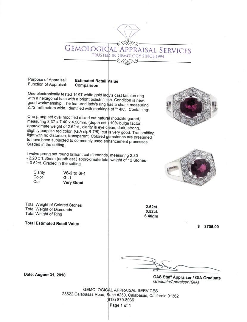 One electronically tested 14KT white gold lady's cast fashion ring with a hexagonal halo with a bright polish finish. The featured lady's ring has a shank measuring 2.72 millimeters wide. Identified with markings of '14K'. Condition is new, good workmanship. Containing: One prong set oval modified mixed cut natural rhodolite garnet, measuring 8.37 x 7.40 x 4.58mm, (depth est.) 10%. bulge factor, approximate weight of 2.62ct., clarity is eye clean, dark, strong, slightly purplish red color, (GIA slpR 7/5), cut is very good. Transmitting light with no distortion, transparent. Colored gemstones are presumed to have been subjected to commonly used enhancement processes. Graded in the setting. Twelve prong set round brilliant cut diamonds, measuring 2.30 - 2.20 x 1.35mm (depth est.) approximate total weight of 12 Stones = 0.52ct. Graded in the setting. Color G - I Clarity VS-2 to SI-1 Cut Very Good. Total Weight of Colored Stones 2.62ct.. Total Weight of Diamonds 0.52ct.. Total Weight of Ring 6.40gm GAS Appraised at $3705.00. GAS Appraised at $3,705.00.
